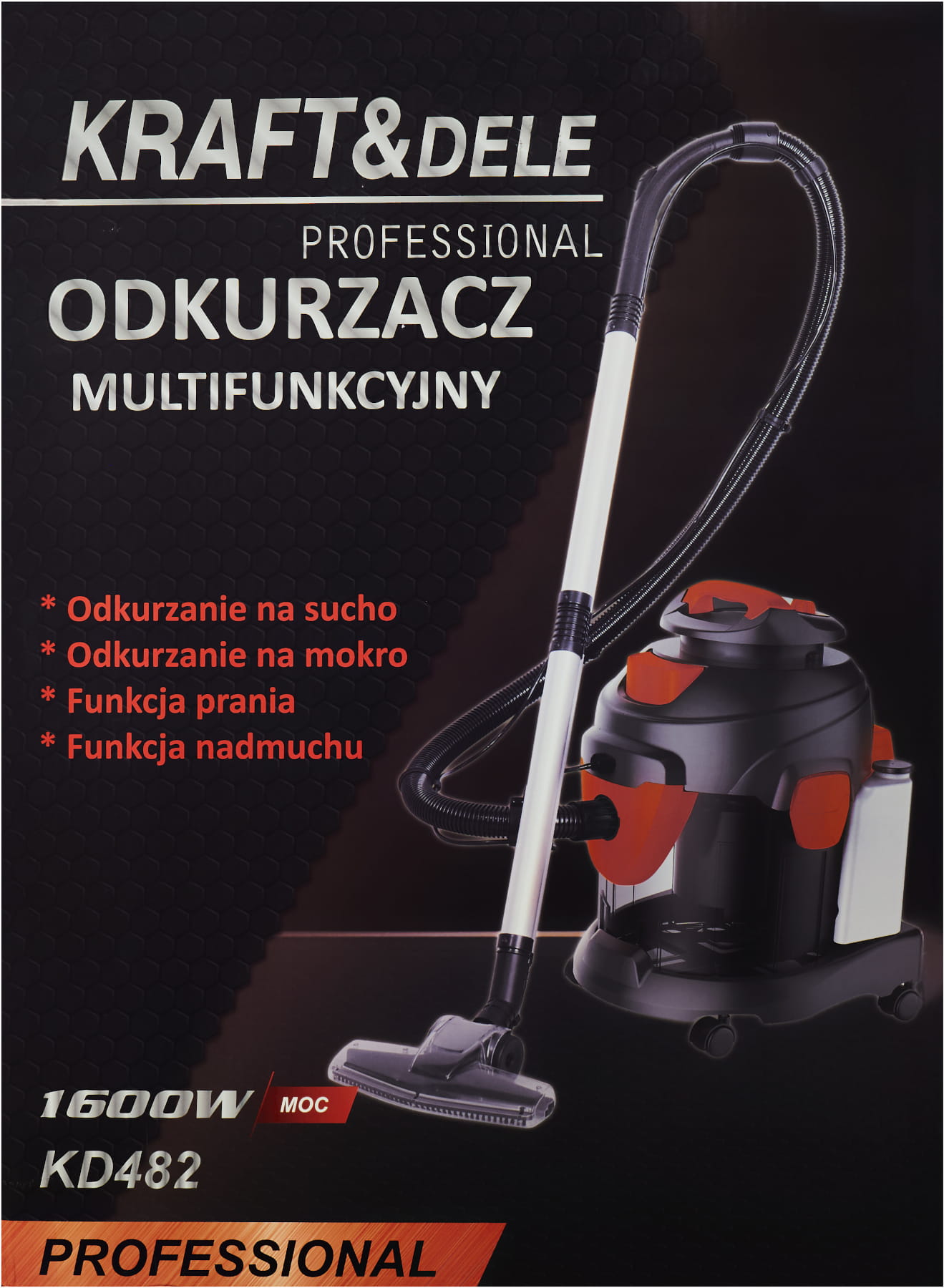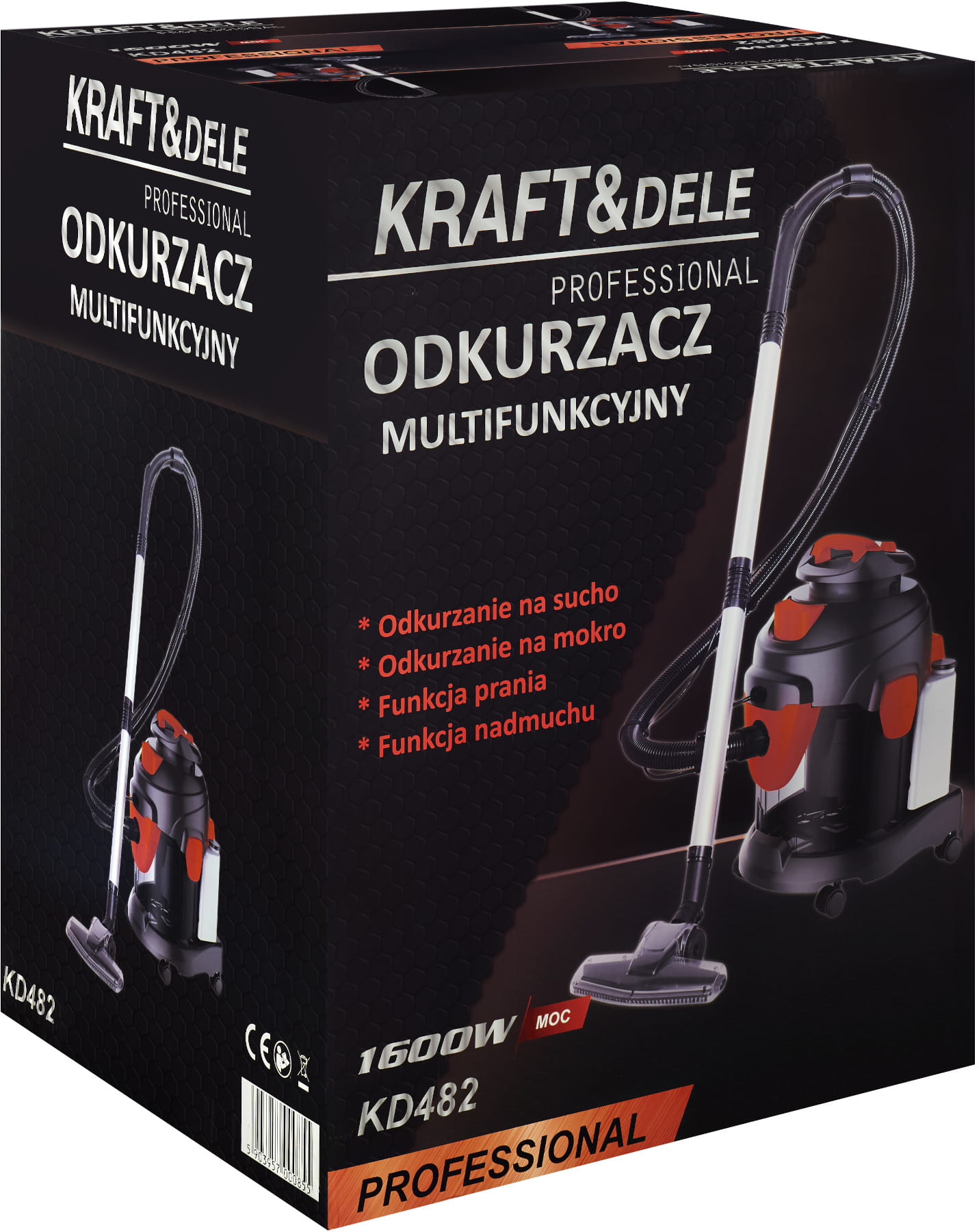 KD482 to wielofunkcyjne urządzenie czyszczące przeznaczone do pracy w warunkach przemysłowych i warsztatowych. Łączy funkcje odkurzacza suchego, odkurzacza mokrego, pralki ekstrakcyjnej do dywanów i wykładzin oraz dmuchawy. Silnik o mocy 1600W zapewnia przepływ powietrza na poziomie 33,3 l/s, co przekłada się na skuteczne zbieranie zarówno drobnego pyłu, jak i większych zanieczyszczeń stałych i ciekłych.