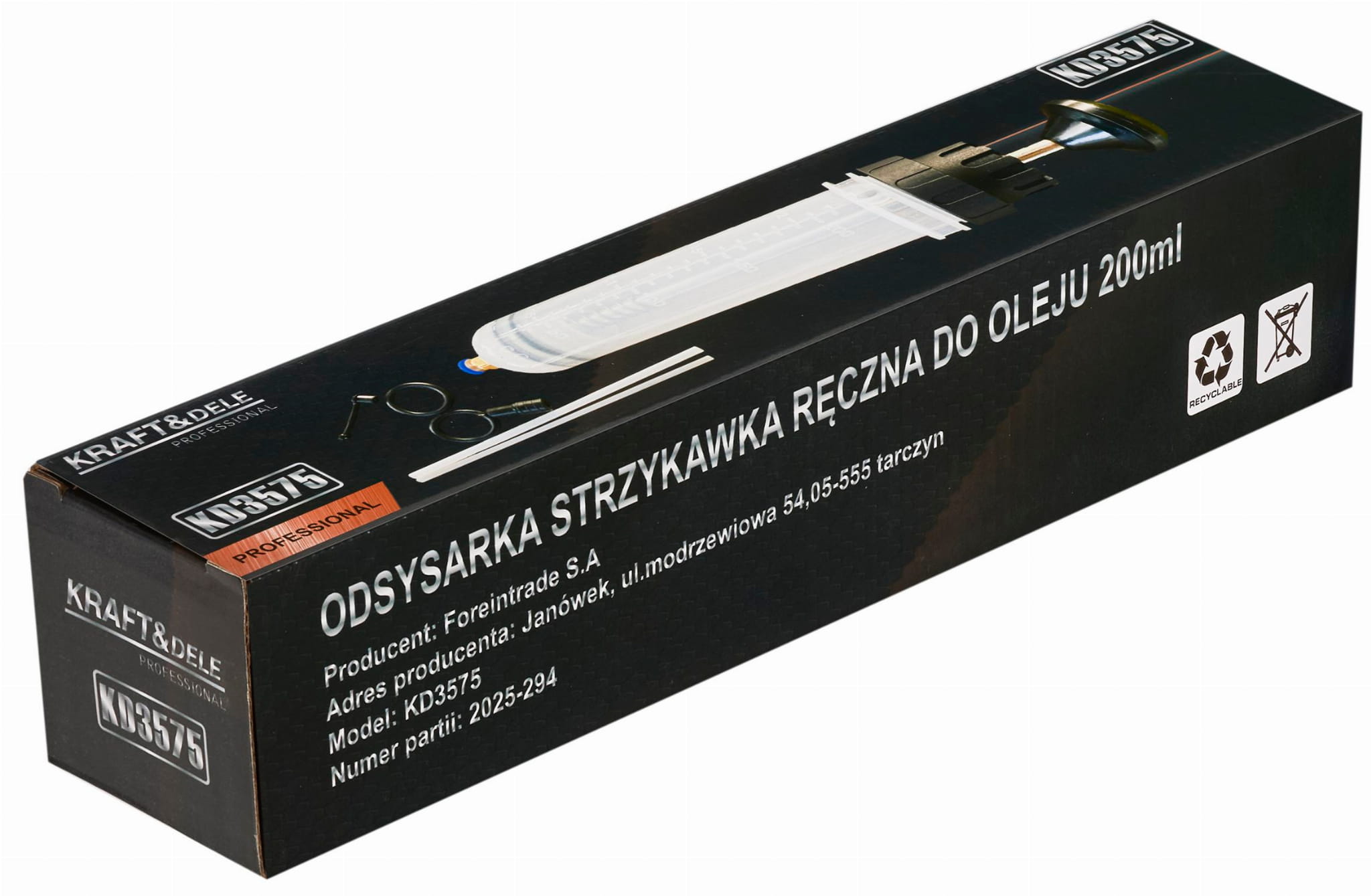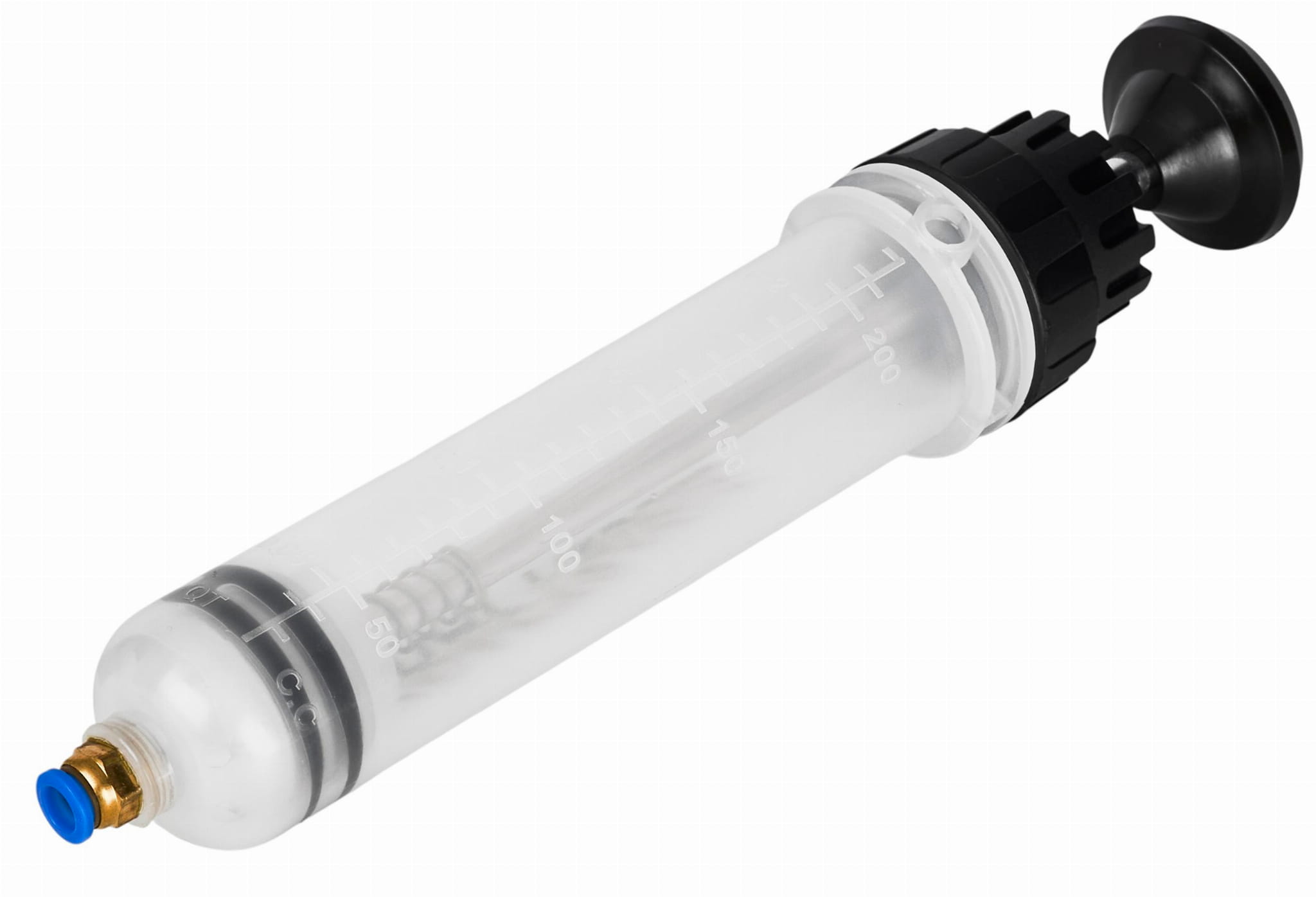 Zbiornik o pojemności 200 ml pozwala na pobranie lub dozowanie płynu w jednym cyklu pracy bez konieczności wielokrotnego opróżniania — przydatne przy uzupełnianiu poziomów oleju w silnikach i przekładniach.