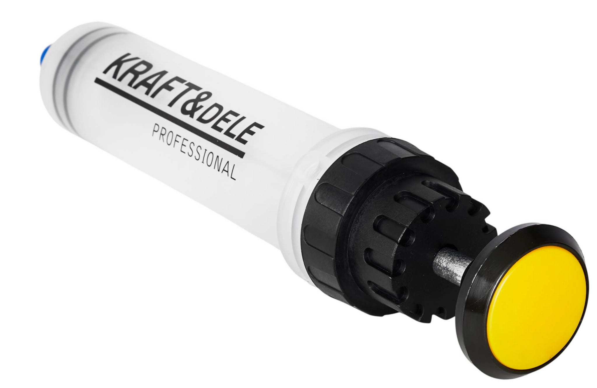 Strzykawkowy mechanizm tłokowy nie wymaga zasilania elektrycznego ani sprężonego powietrza. Narzędzie działa niezależnie od dostępności źródła zasilania — sprawdza się zarówno w warsztacie, jak i w terenie.