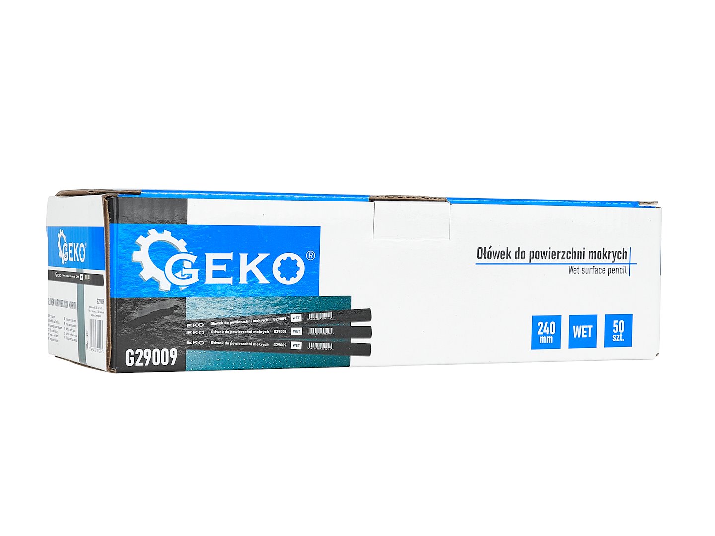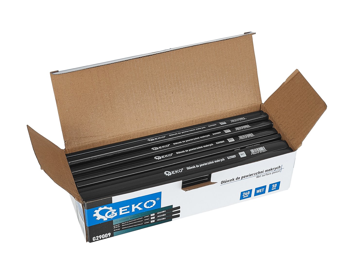 Ołówek przeznaczony do znakowania i opisywania powierzchni mokrych, wilgotnych oraz trudnych do pisania — stosowany na budowie, w pracach murarskich, ciesielskich i instalacyjnych. Długość 240 mm zapewnia wygodny chwyt nawet w rękawicach roboczych. Produkt dostępny w kartoniku wystawowym zawierającym 50 sztuk, co ułatwia ekspozycję i sprzedaż detaliczną.
