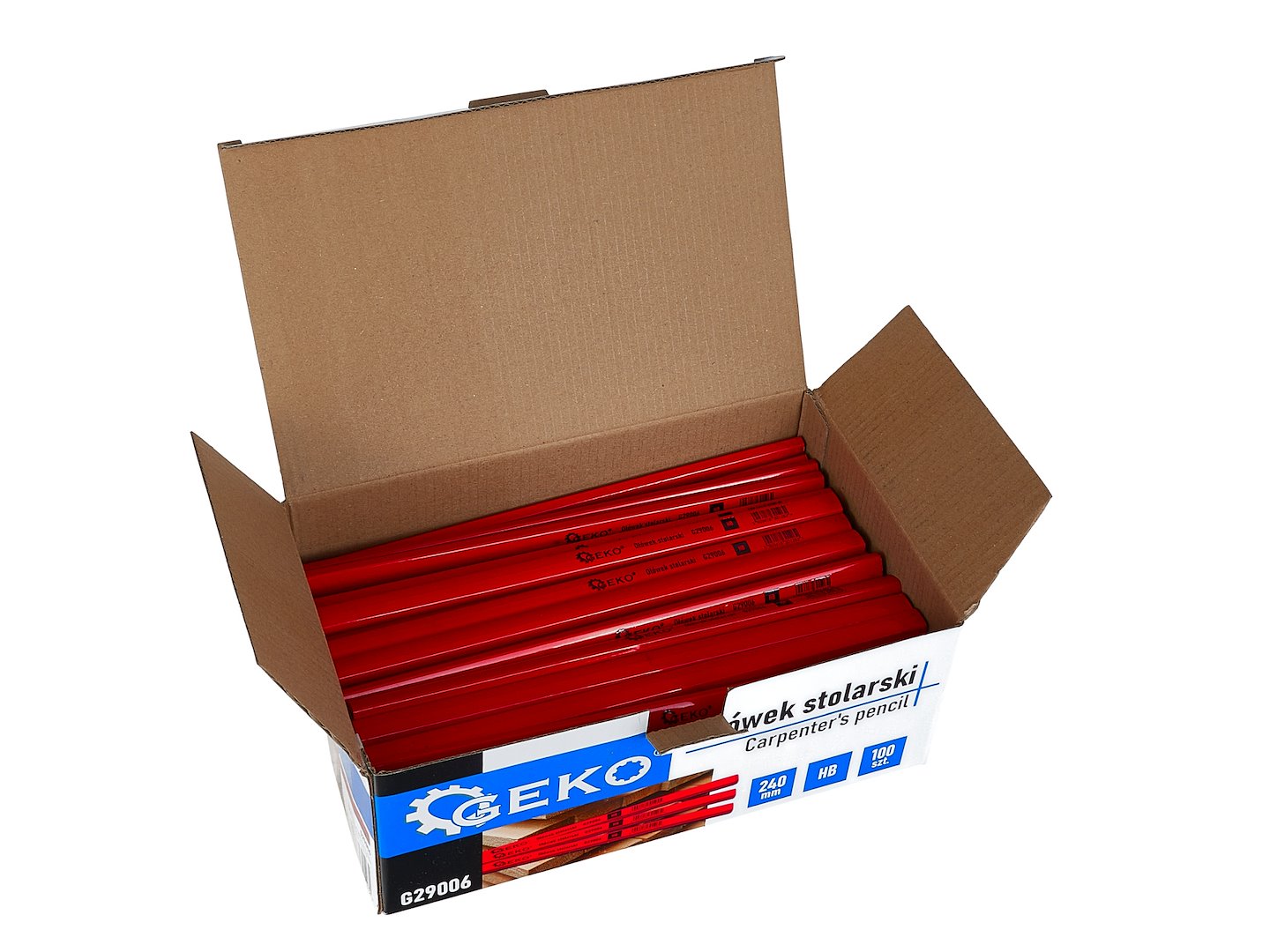 Ołówek stolarski o długości 240 mm z grafitem klasy HB, przeznaczony do znakowania i trasowania na drewnie, betonie, cegle oraz innych materiałach budowlanych. Zestaw zawiera 100 sztuk pakowanych w kartonik wystawowy, co ułatwia ekspozycję i sprzedaż detaliczną.