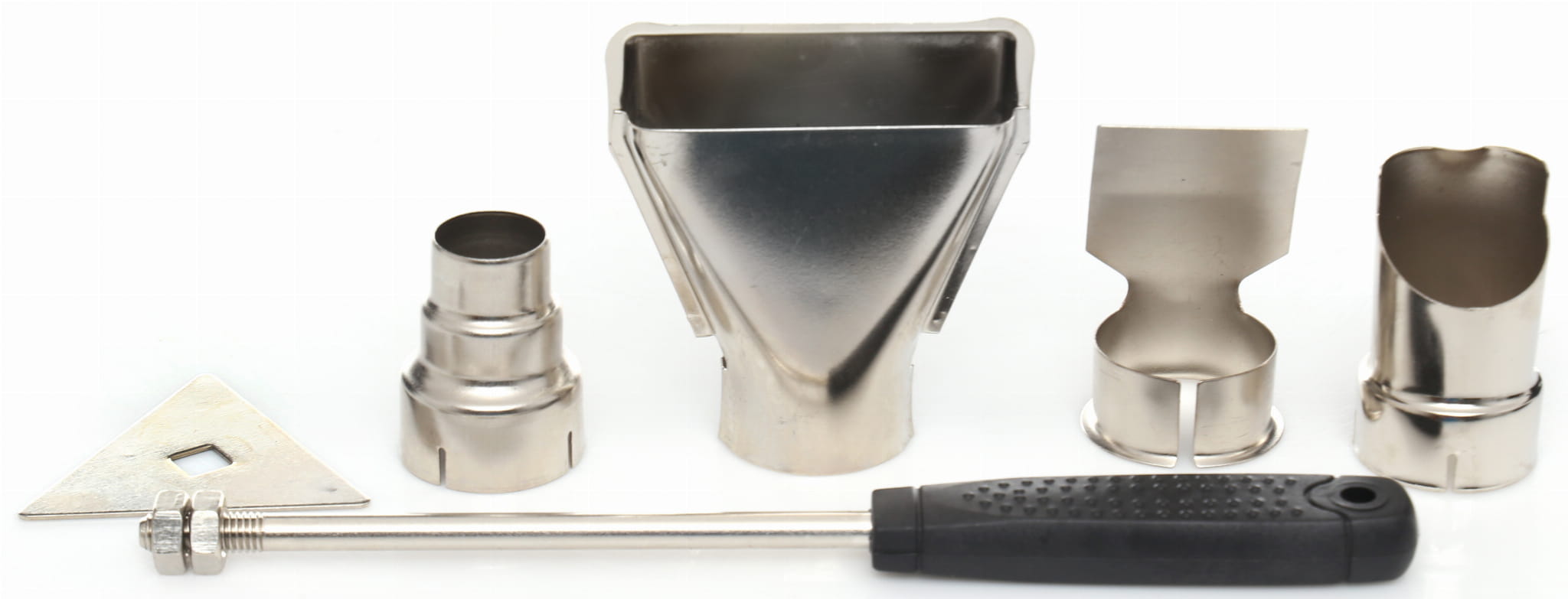 Cztery dołączone końcówki robocze umożliwiają kierowanie strumienia gorącego powietrza na różne kształty powierzchni — wąskie szczeliny, rury czy płaskie panele. Skrobak trójkątny ułatwia mechaniczne usuwanie zmiękczonych powłok malarskich bezpośrednio podczas pracy z opalerką.