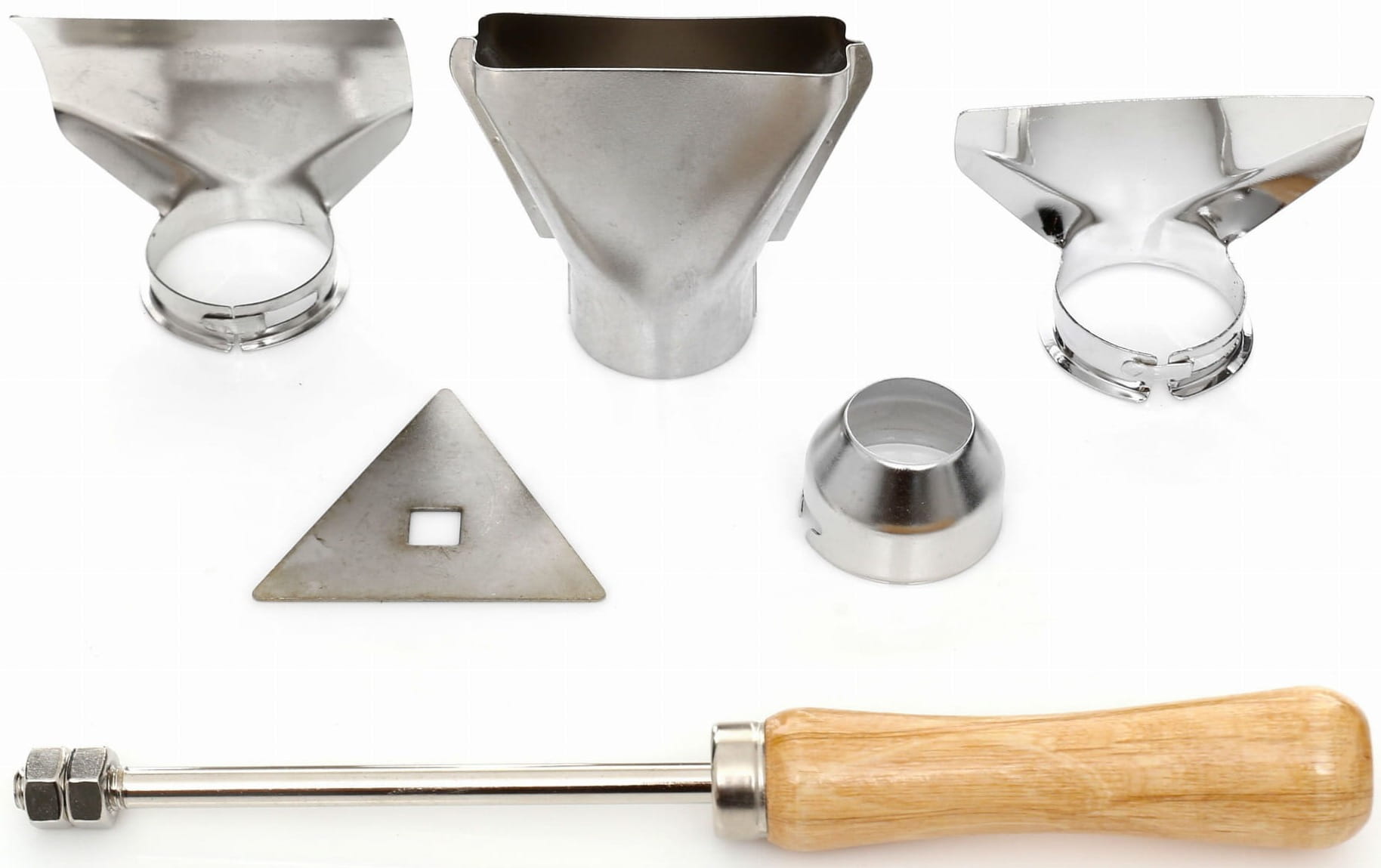 Cztery dołączone końcówki robocze umożliwiają koncentrację strumienia gorącego powietrza, kierowanie go wzdłuż powierzchni lub ochronę wrażliwych elementów podczas pracy. Skrobak trójkątny ułatwia mechaniczne usuwanie zmiękczonych powłok lakierniczych.