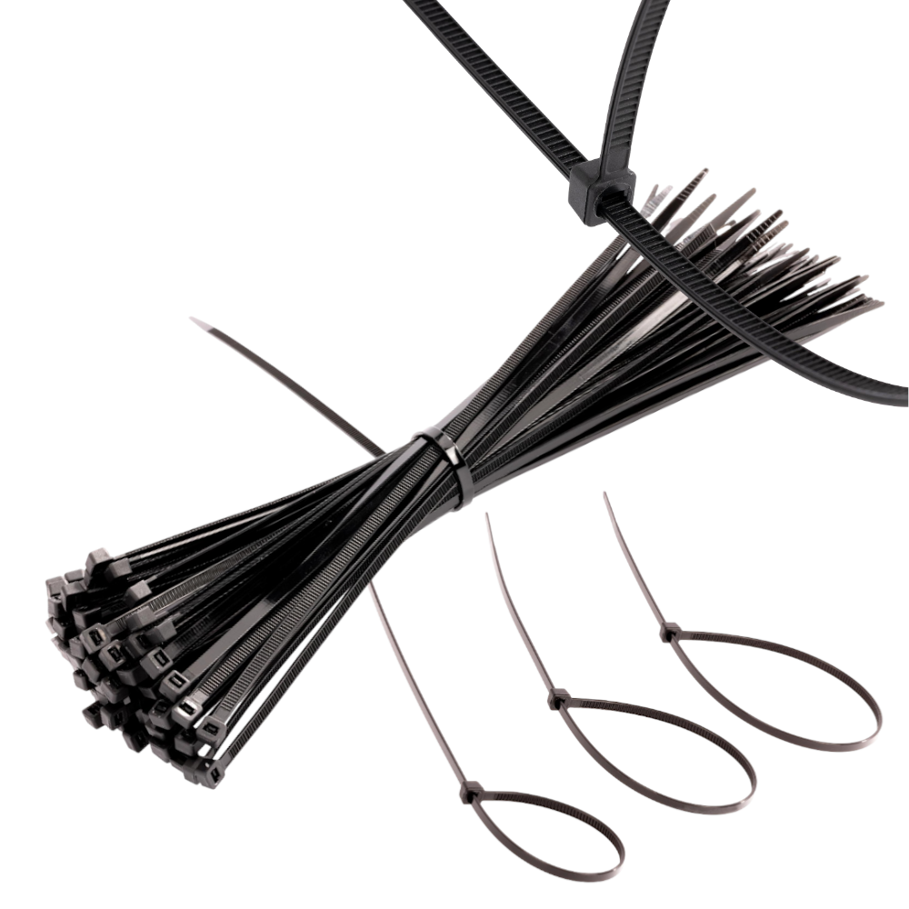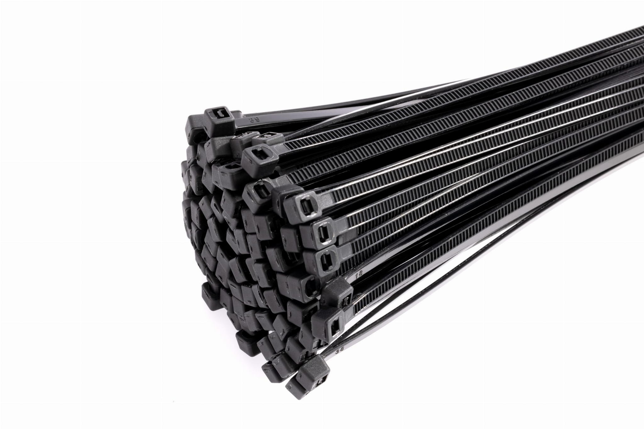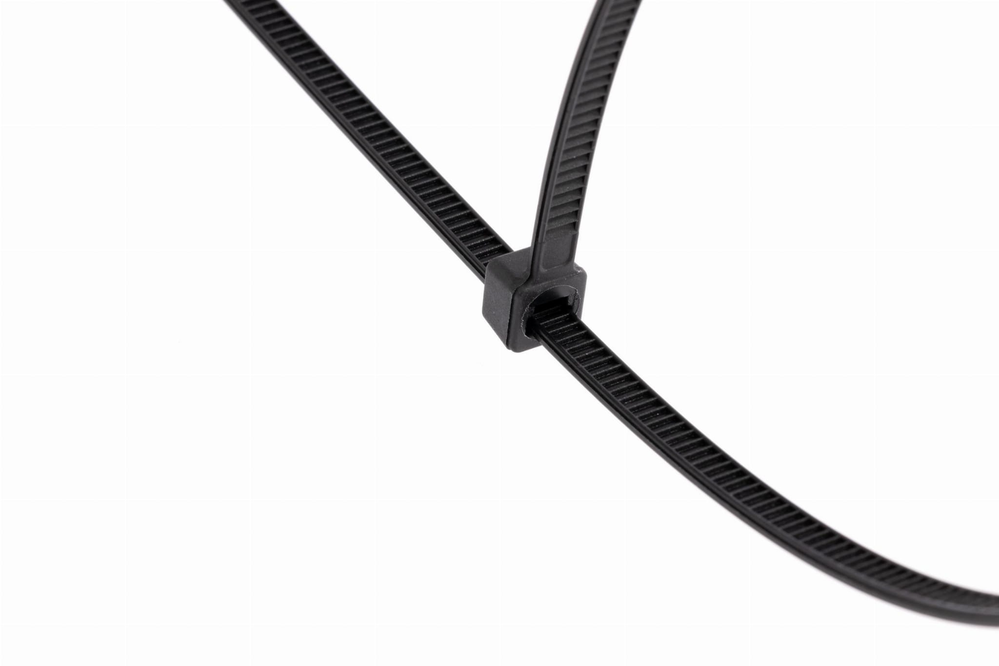 Opaski zaciskowe wykonane z nylonu w kolorze czarnym, przeznaczone do porządkowania i mocowania wiązek kabli, przewodów oraz węży w instalacjach elektrycznych i mechanicznych. Zestaw zawiera 100 sztuk opasek o szerokości 3,6 mm i długości 300 mm.