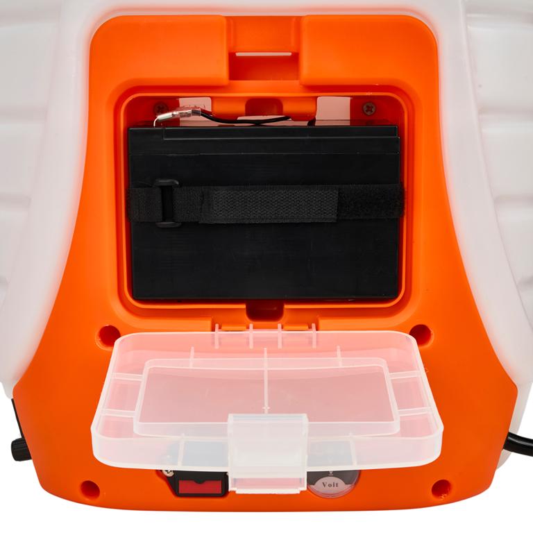 Akumulator ołowiowo-kwasowy o pojemności 8Ah zapewnia do 8 godzin ciągłej pracy na jednym ładowaniu. Klapka rewizyjna umożliwia wyjęcie akumulatora bez demontażu zbiornika — akumulator można ładować poza urządzeniem za pomocą dołączonej ładowarki 230V/12V/1A.