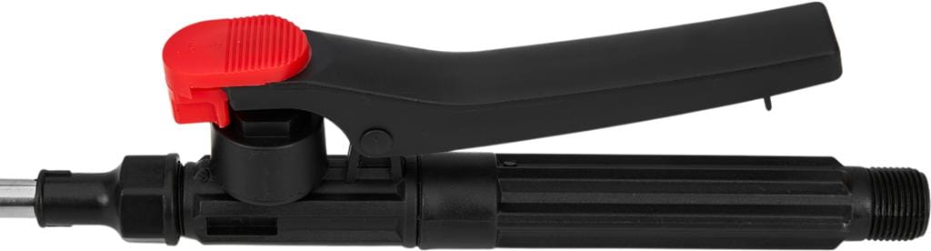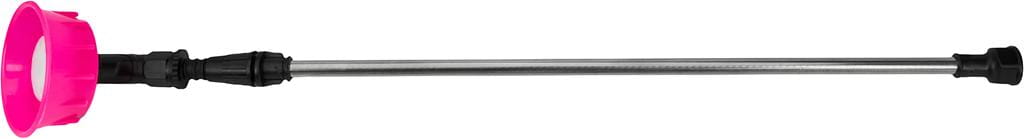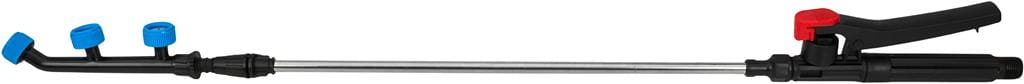 Metalowa lanca teleskopowa z wymiennymi dyszami umożliwia oprysk na różnych wysokościach i odległościach. W zestawie znajduje się dysza szeroka z rozpryskiem, dysza osłonowa oraz lanca rzędowa 3-dyszowa pozioma — przydatna przy oprysku roślin w rzędach i regulacji kierunku strumienia.