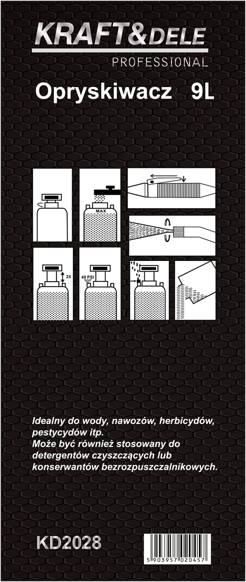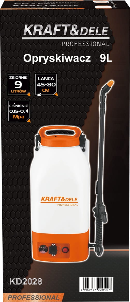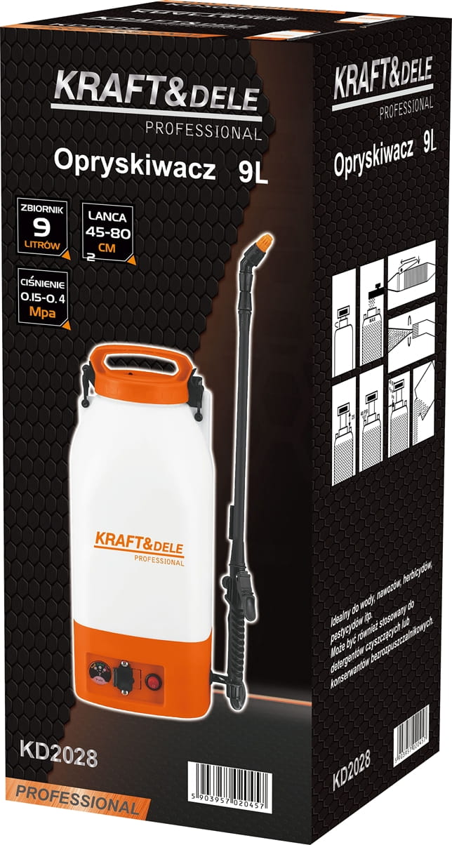 Zbiornik o pojemności 9 litrów pozwala na dłuższą pracę bez uzupełniania cieczy. Dwa paski nośne umożliwiają noszenie urządzenia na plecach, co odciąża nadgarstki i ramiona podczas wielominutowych sesji oprysku. Konstrukcja plecakowa sprawdza się szczególnie przy pracy na większych powierzchniach.