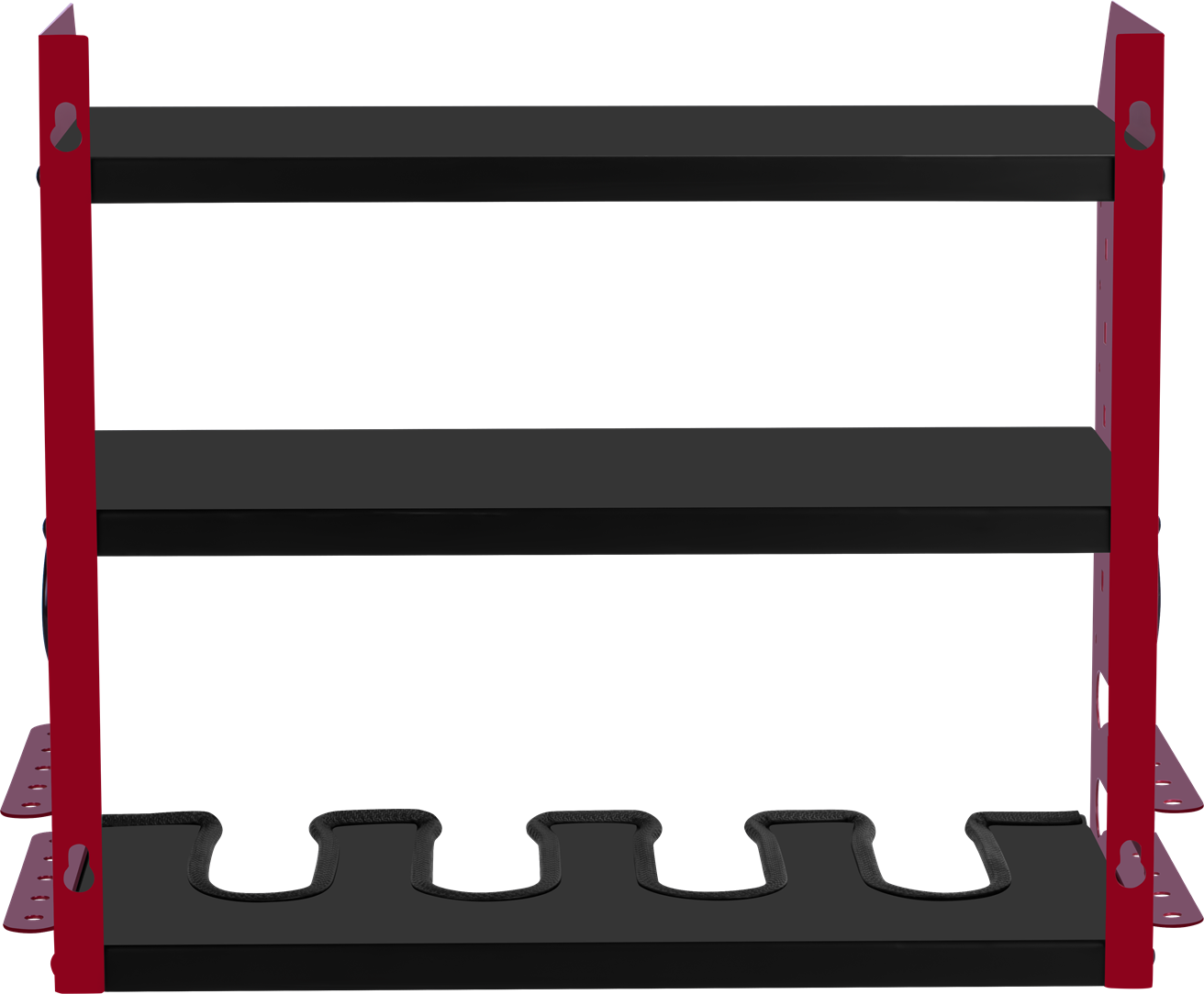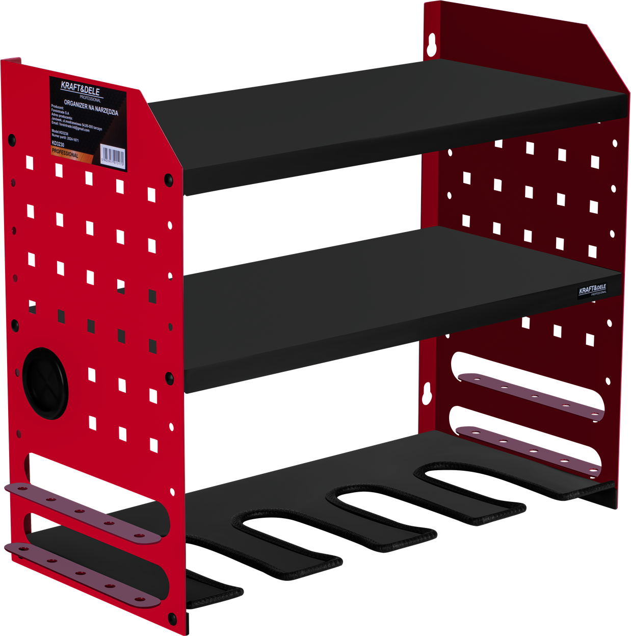 Stalowy organizer ścienny przeznaczony do przechowywania elektronarzędzi, wiertarek, wkrętarek i akcesoriów warsztatowych. Trzypoziomowa konstrukcja montowana bezpośrednio na ścianie umożliwia segregację sprzętu według rozmiaru lub przeznaczenia, porządkując przestrzeń roboczą bez zajmowania powierzchni podłogi.