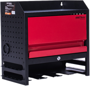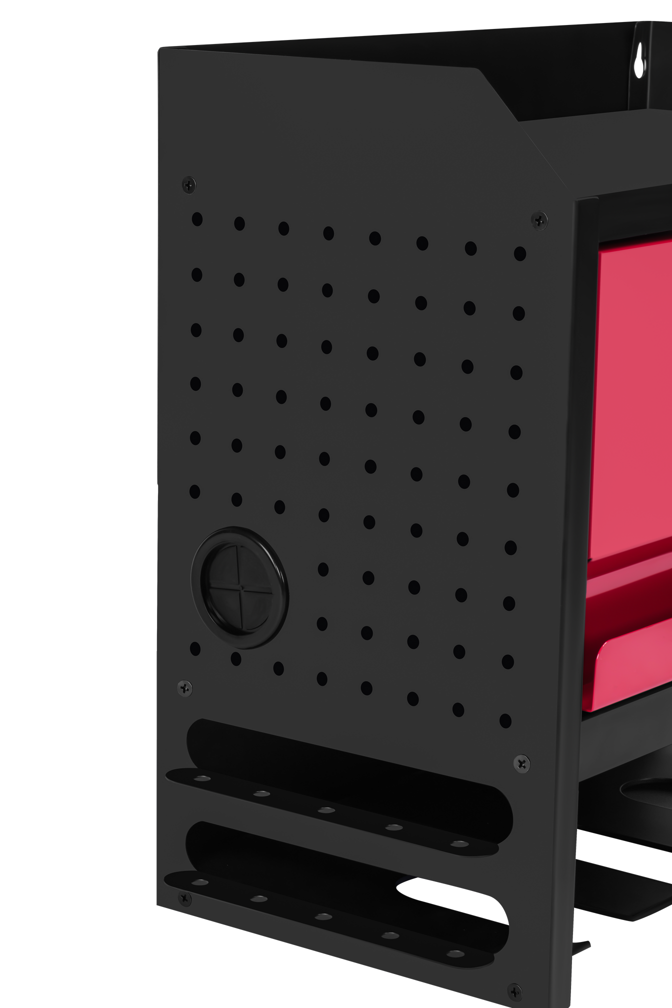 Stalowy organizer ścienny przeznaczony do przechowywania elektronarzędzi, wiertarek, wkrętarek i akcesoriów warsztatowych. Trzypoziomowa konstrukcja z zamykanymi drzwiczkami na kluczyk umożliwia segregację sprzętu według rodzaju lub gabarytów przy jednoczesnym zabezpieczeniu zawartości przed nieautoryzowanym dostępem.