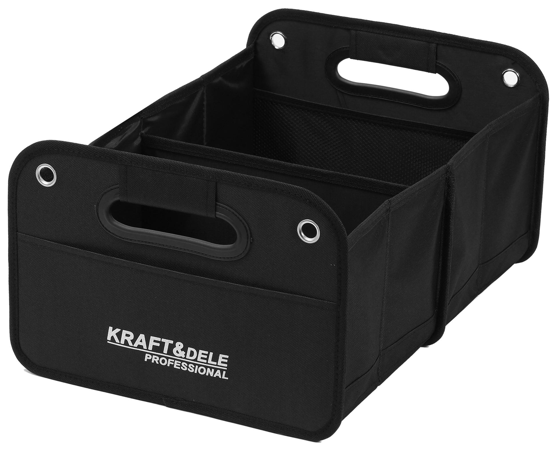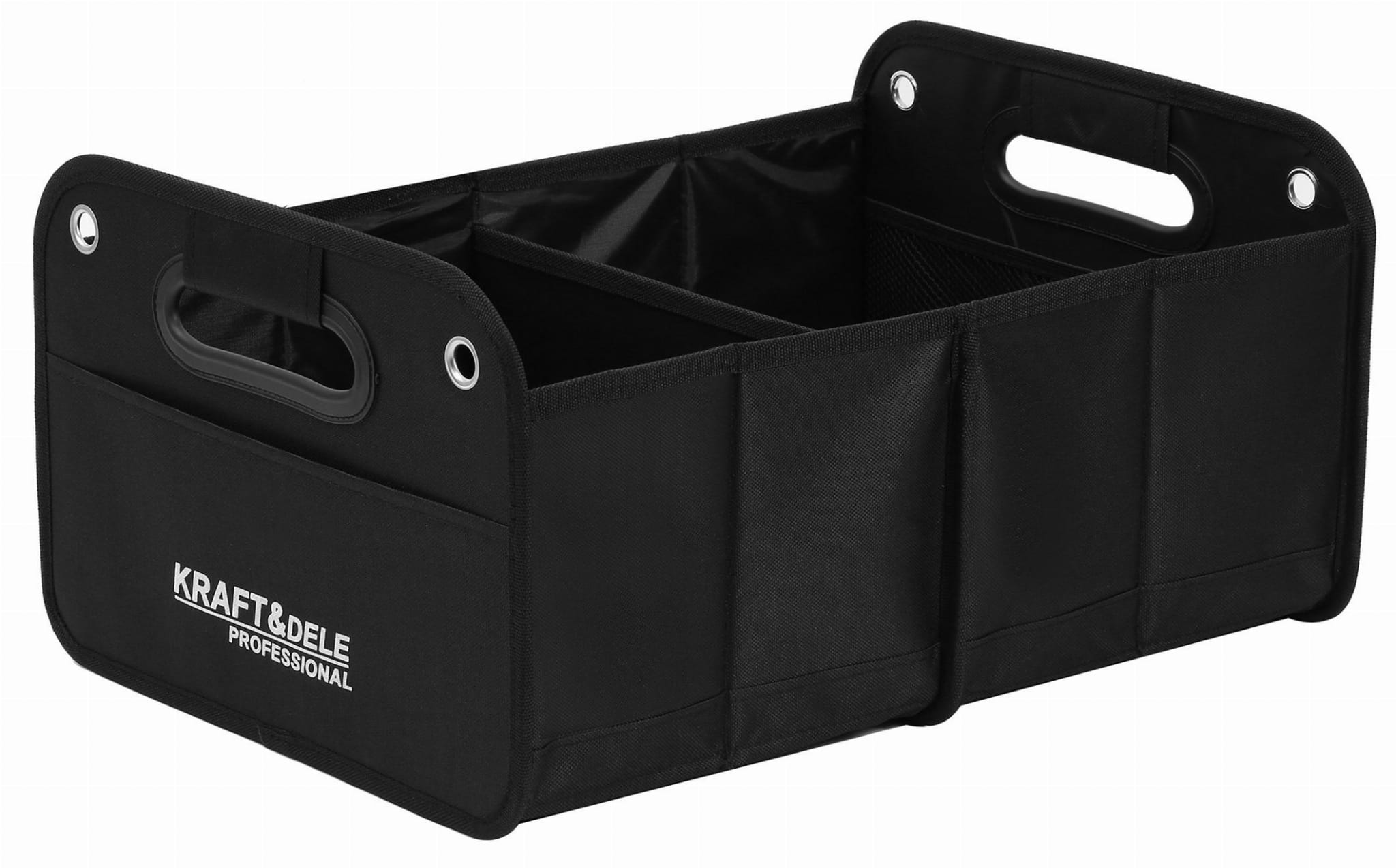 Podział na dwie główne komory umożliwia rozdzielenie przedmiotów według kategorii — np. artykuły spożywcze osobno od narzędzi. Zewnętrzna kieszeń przeznaczona jest na drobne akcesoria, dokumenty pojazdu lub rękawiczki robocze.