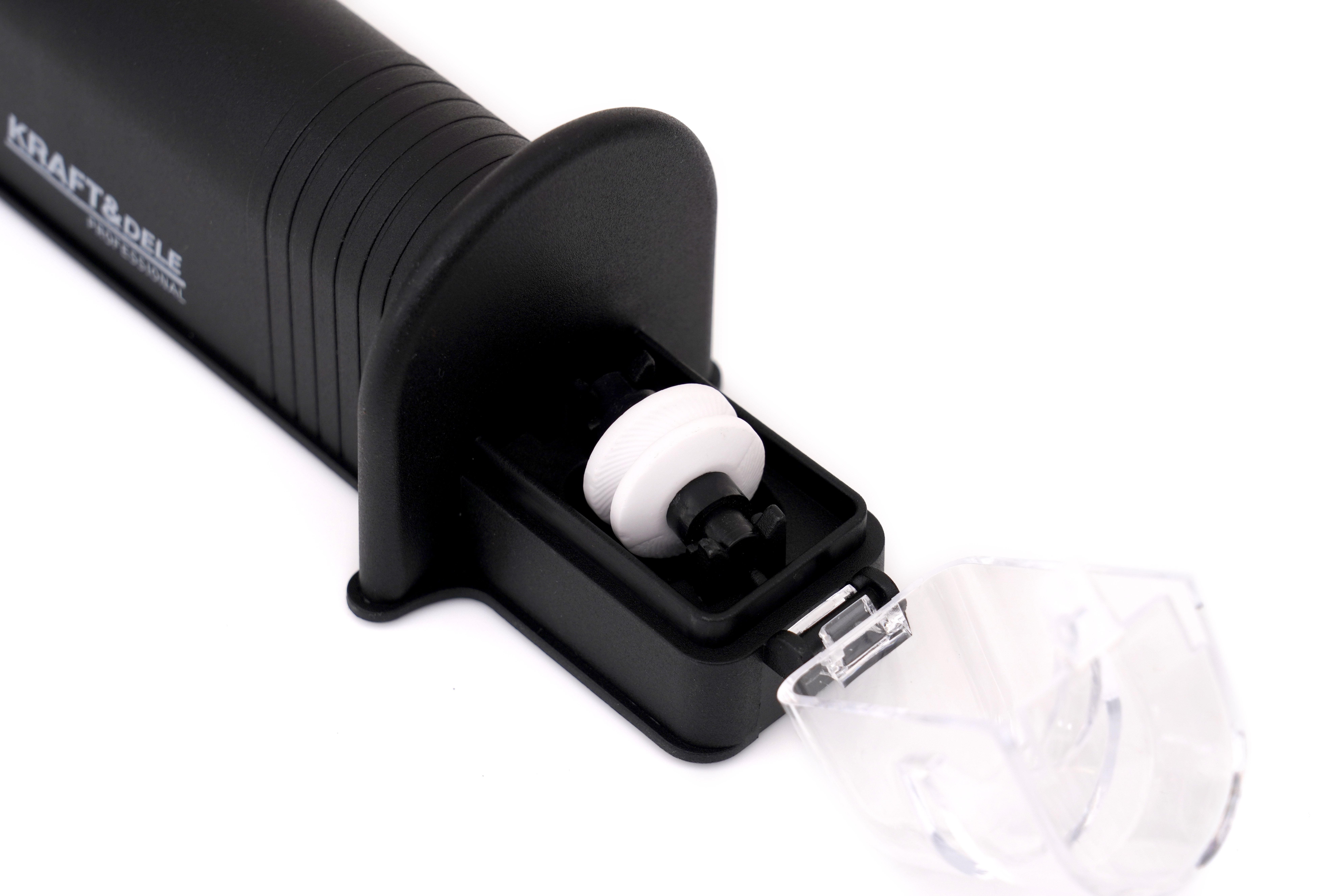 Ostrzałka do noży ceramiczna KD10588 to proste narzędzie do szybkiego przywracania ostrości w codziennym użytkowaniu. Regulacja kąta ostrzenia przez przesunięcie wewnętrznej strony ułatwia prowadzenie noża i pomaga uzyskać powtarzalny efekt.