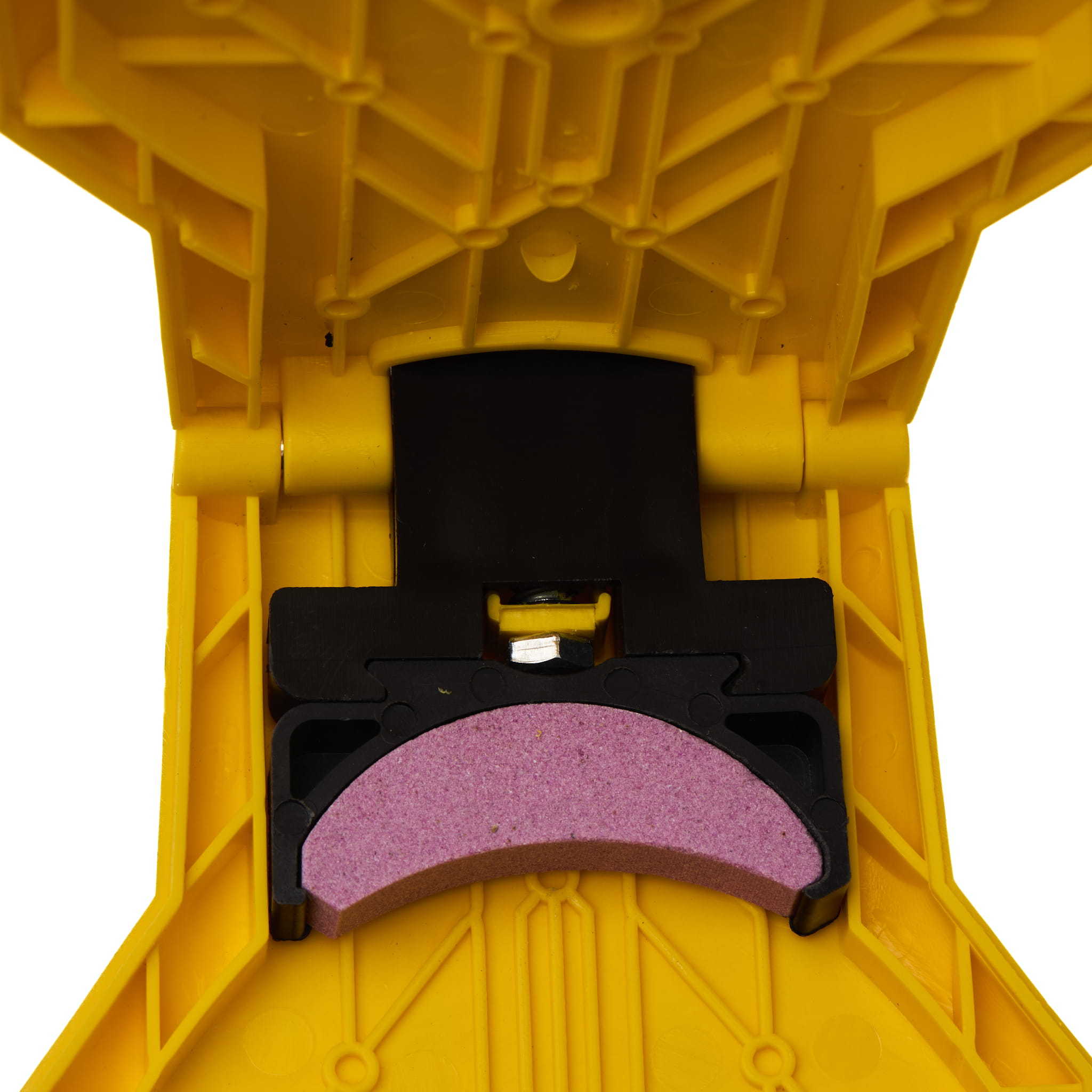 Prawidłowy kąt zęba tnącego bezpośrednio wpływa na wydajność cięcia i żywotność łańcucha. Konstrukcja ostrzałki prowadzi kamień pod stałym, powtarzalnym kątem, co ogranicza ryzyko nierównomiernego ostrzenia wynikającego z ręcznego pilnikowania.