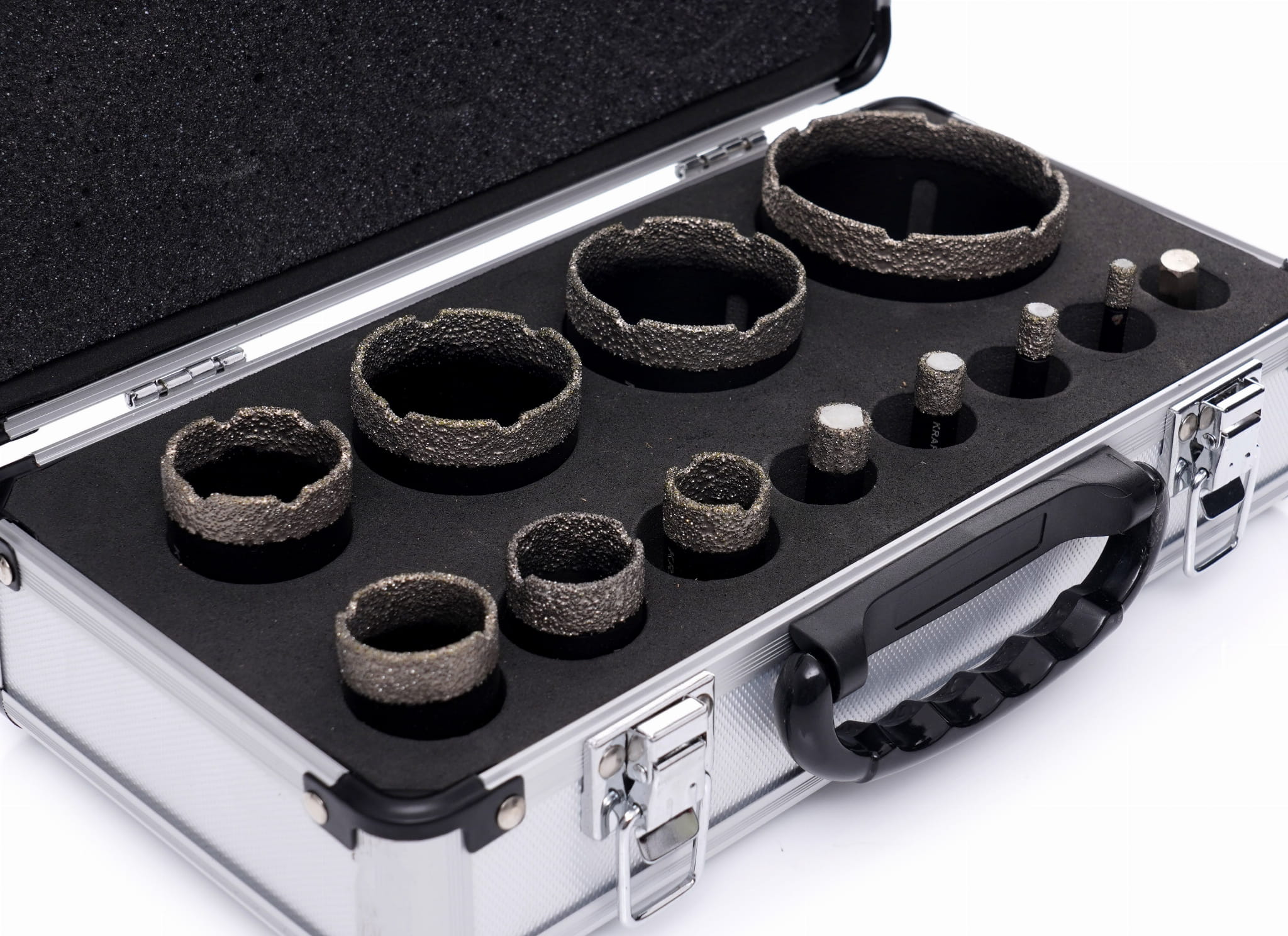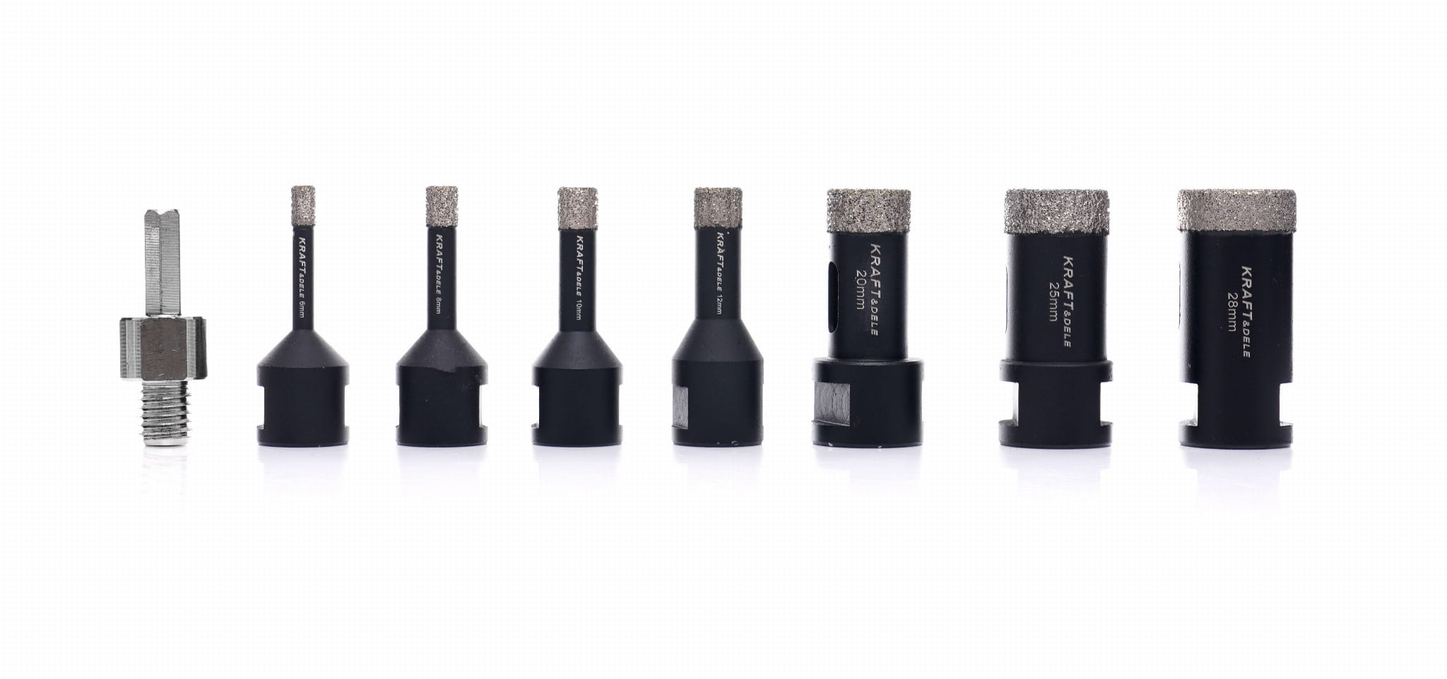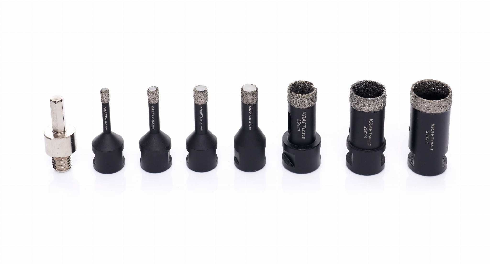 Zestaw 11 koronowych otwornic diamentowych z adapterem przeznaczony do wiercenia na mokro bez udaru w materiałach ceramicznych, gresowych i kamiennych. Nasyp diamentowy lutowany próżniowo zapewnia trwałe połączenie ściernicy ze stalowym korpusem, co przekłada się na stabilną pracę przy powtarzalnych wierceniach.