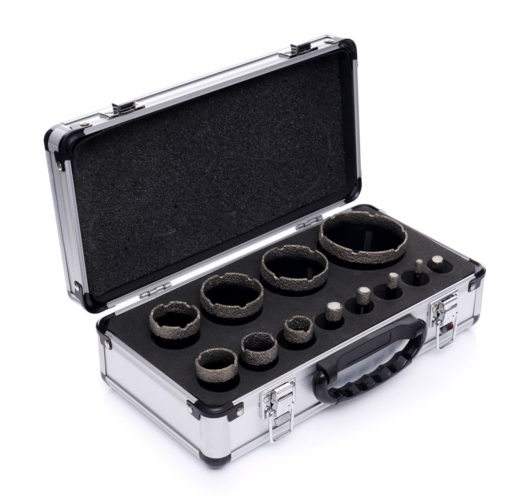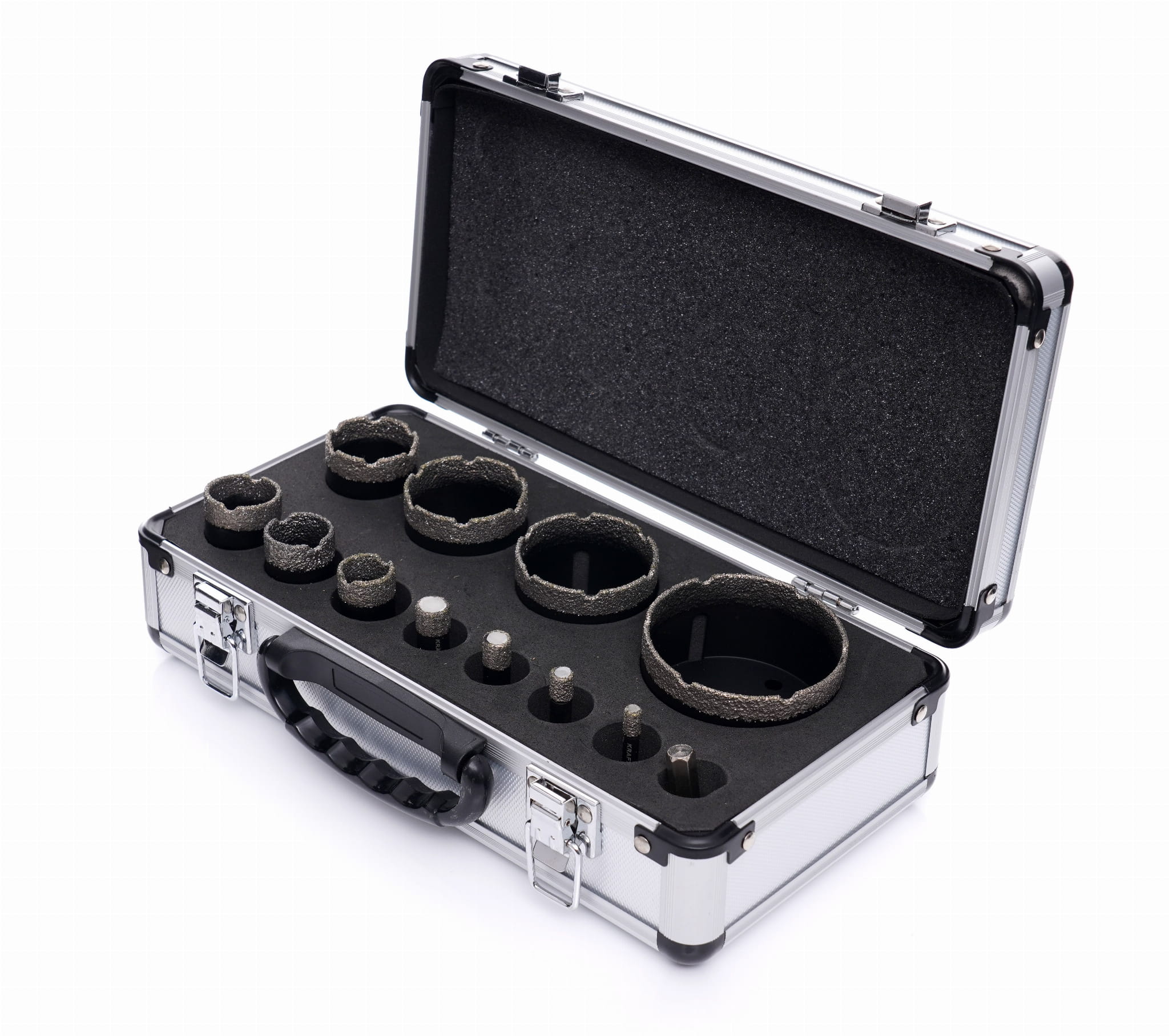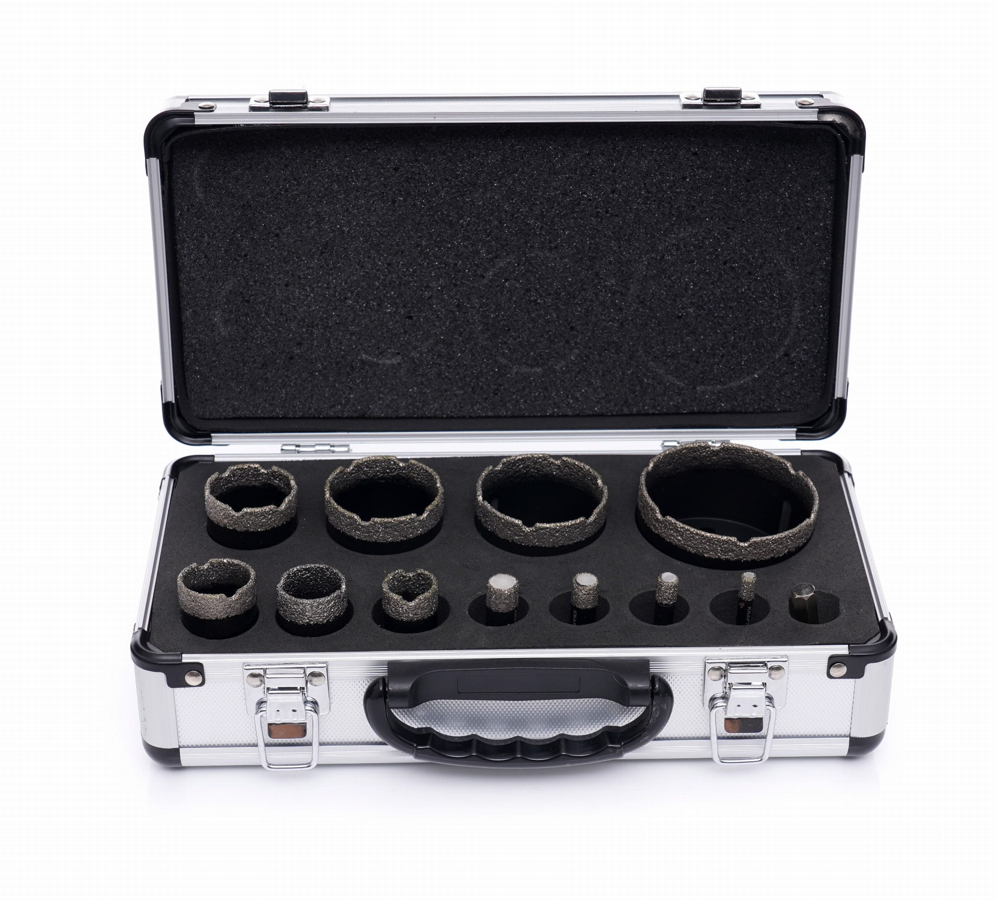 Zestaw 11 koronowych otwornic diamentowych z adapterem przeznaczony do wiercenia na mokro bez udaru w materiałach ceramicznych, gresowych i kamiennych. Nasyp diamentowy lutowany próżniowo zapewnia trwałe połączenie ściernicy ze stalowym korpusem, co przekłada się na stabilną pracę przy powtarzalnych wierceniach.