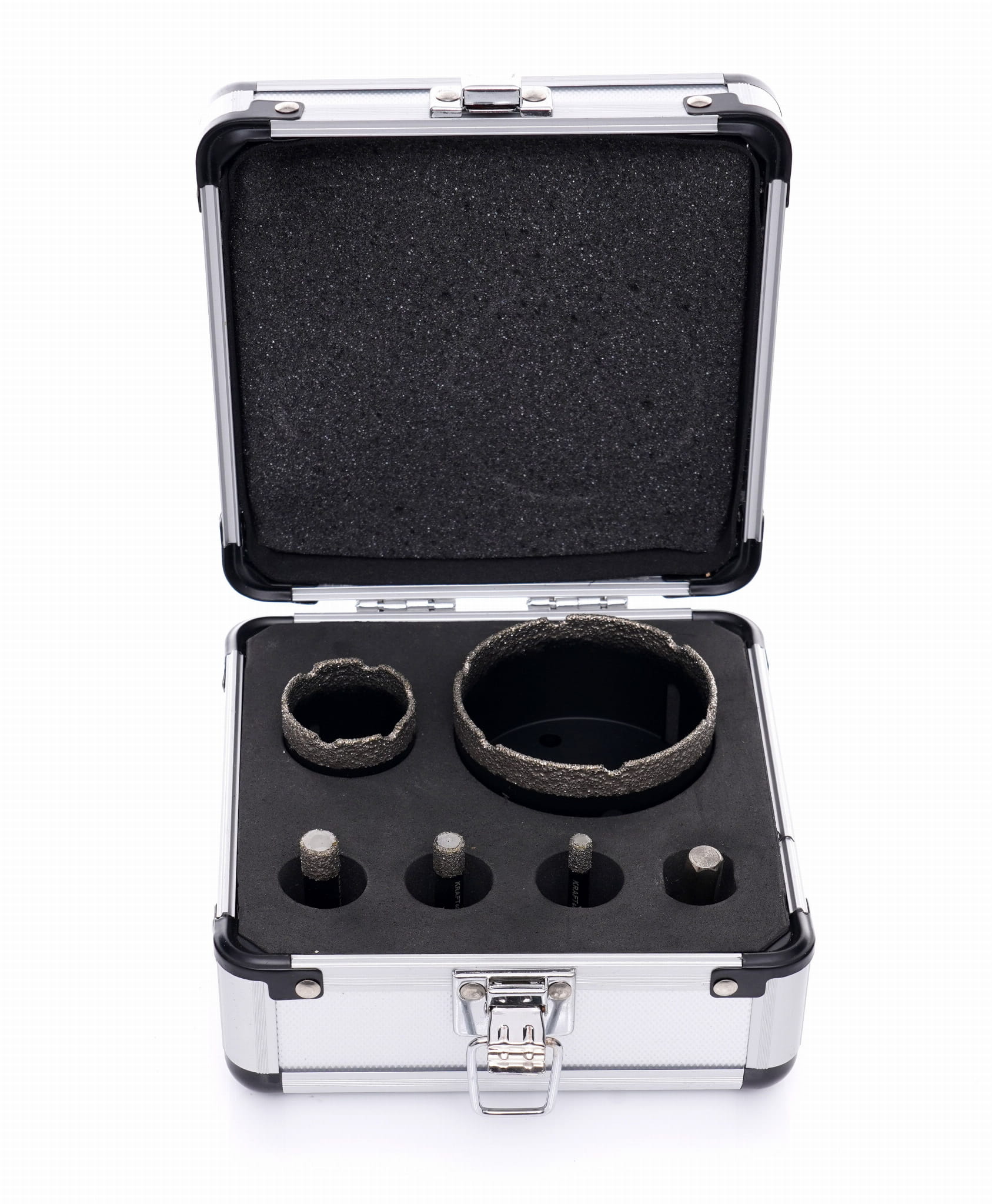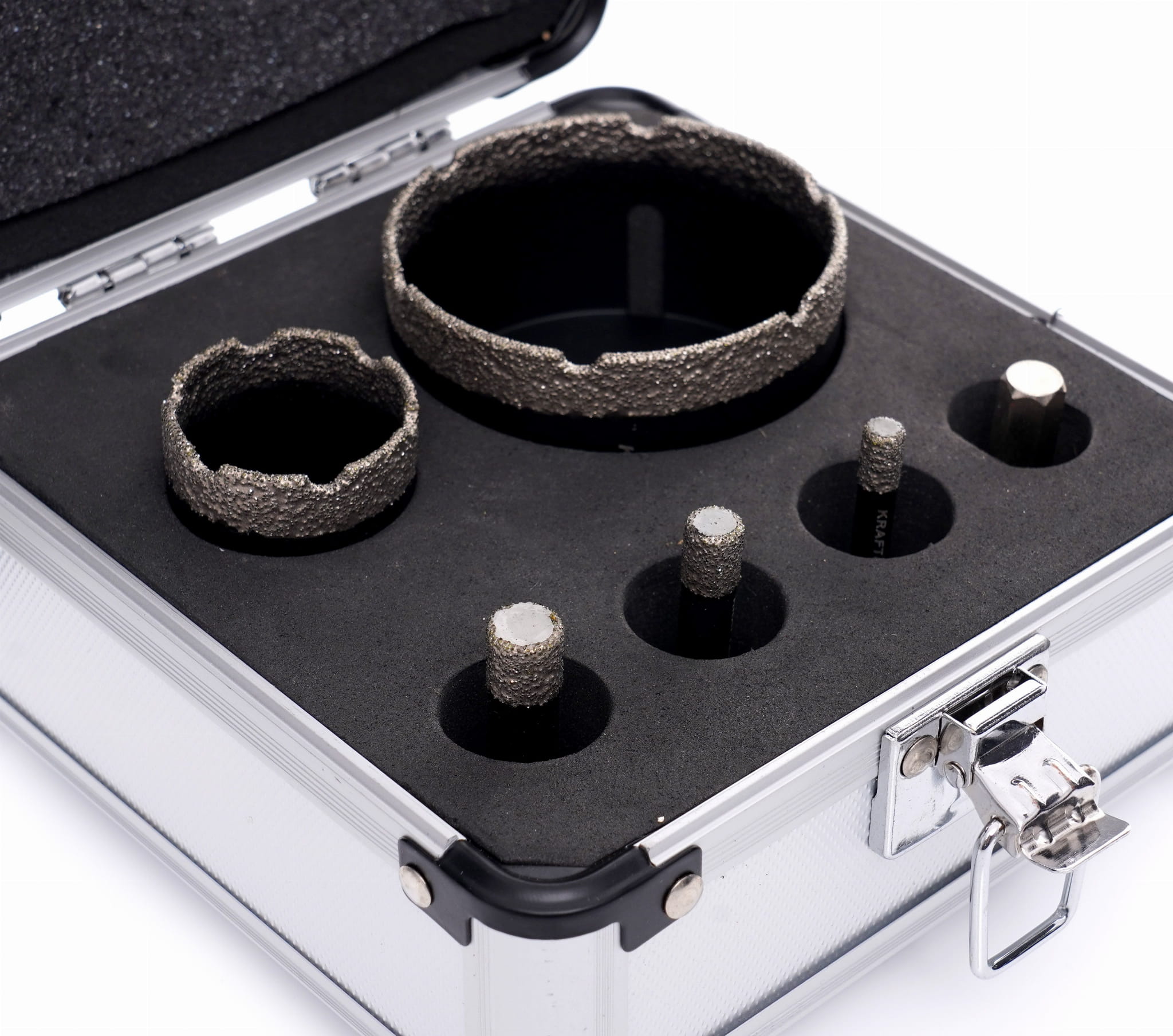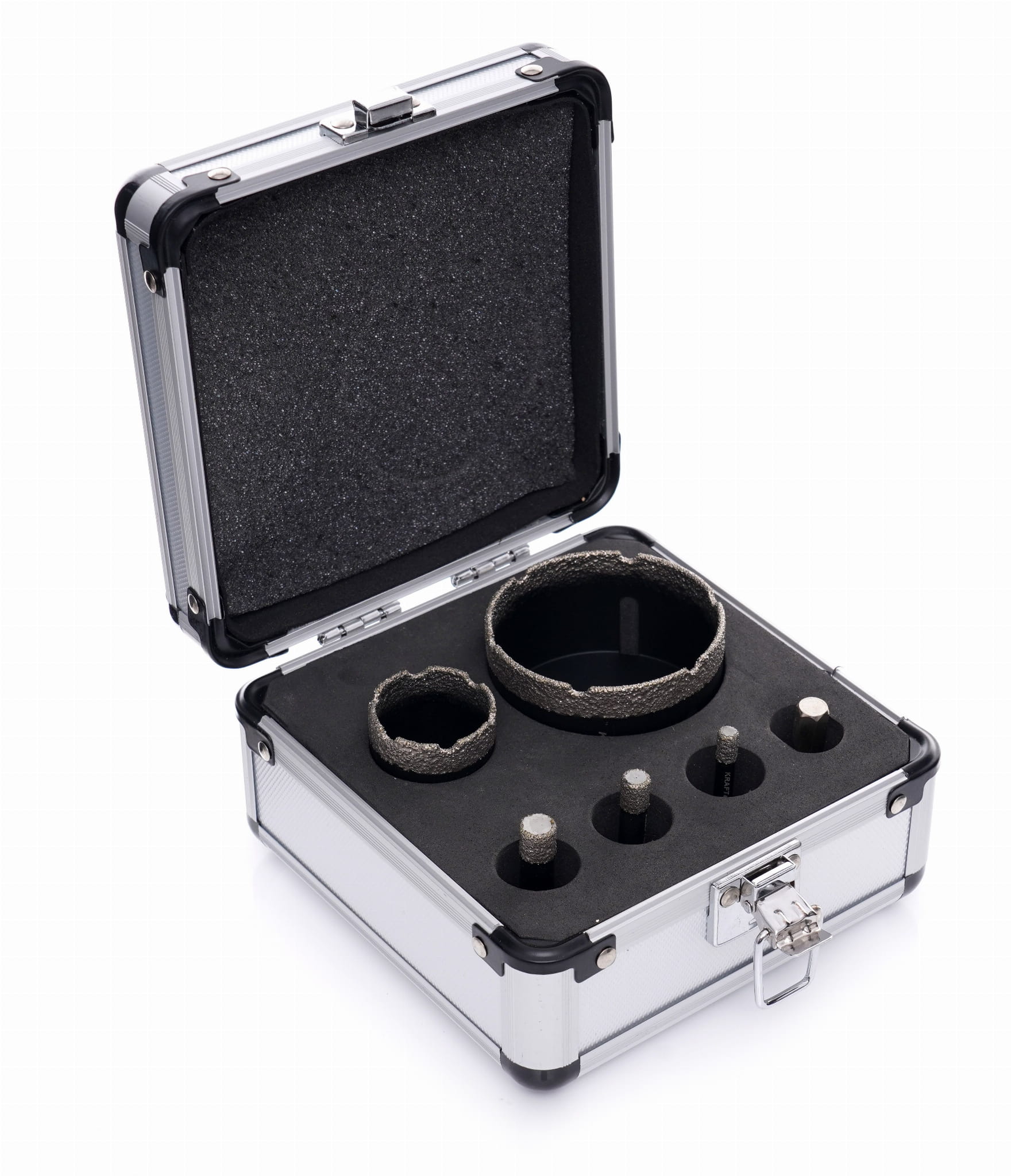 KD11226 to zestaw sześciu otwornic koronowych z nasypem diamentowym, przeznaczonych do wiercenia bez udaru metodą mokrą w materiałach ceramicznych i kamiennych. Zestaw obejmuje szeroki zakres średnic — od 6 mm do 68 mm — oraz adapter M14 do 3/8 HEX umożliwiający montaż w standardowych wiertarkach.