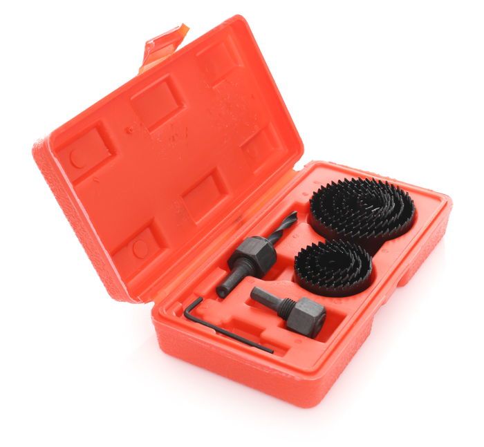 Zestaw zawiera wszystkie elementy niezbędne do zamocowania otwornic w uchwycie wiertarki lub wiertarko-wkrętarki, co eliminuje konieczność osobnego dobierania trzpieni i kluczy.