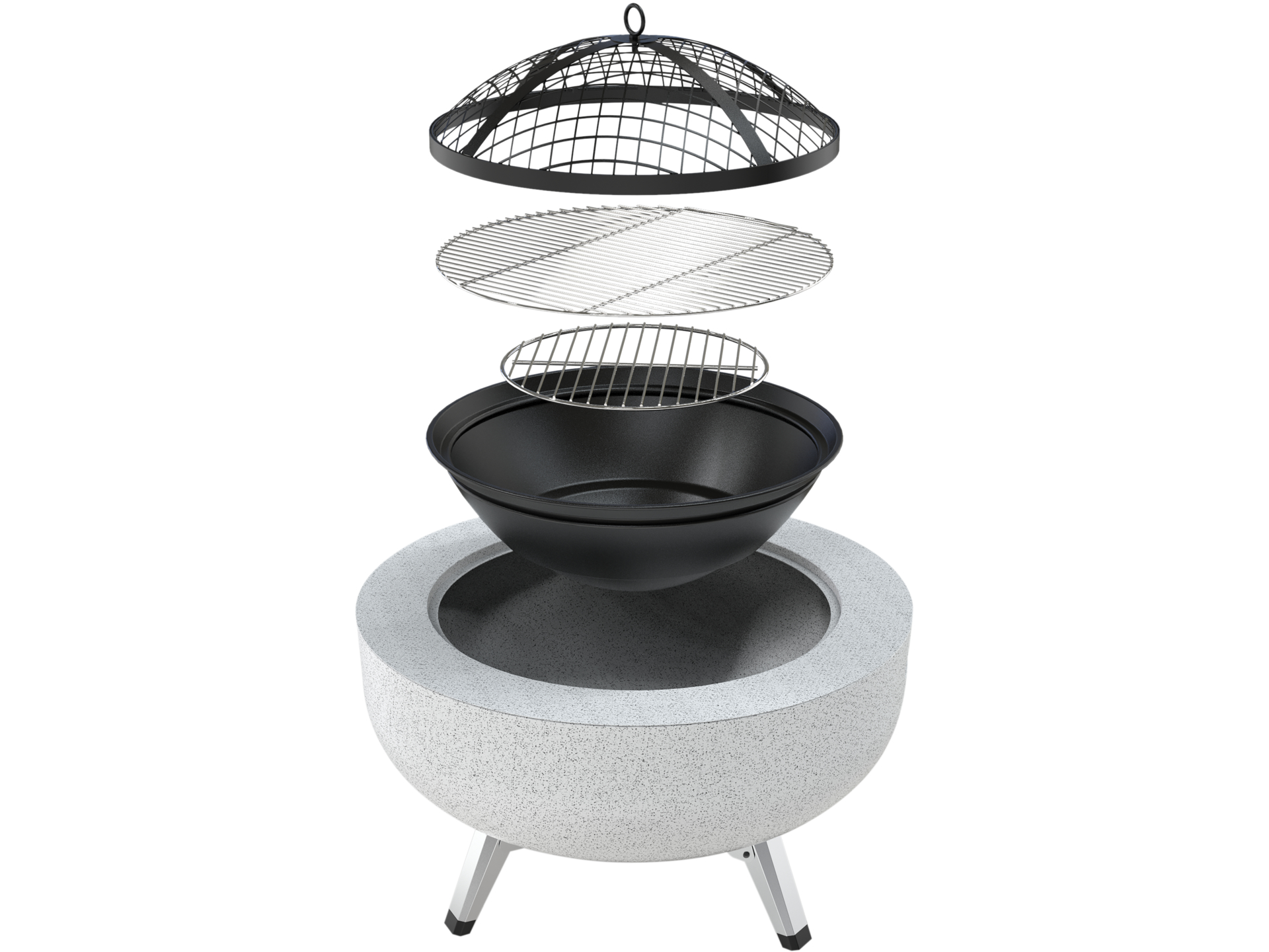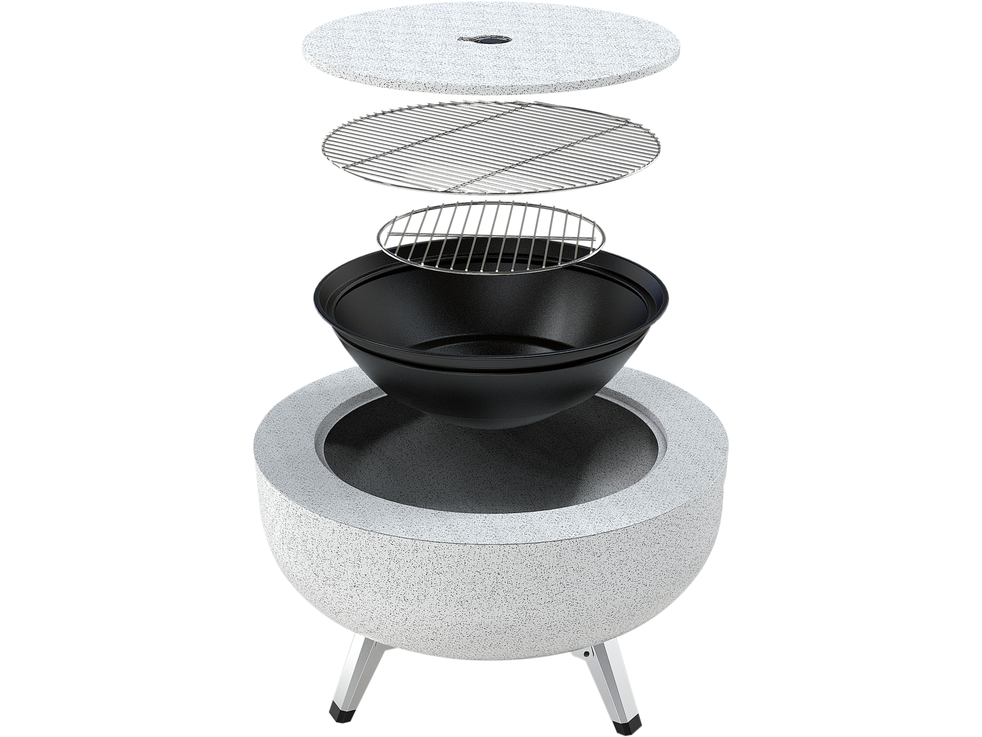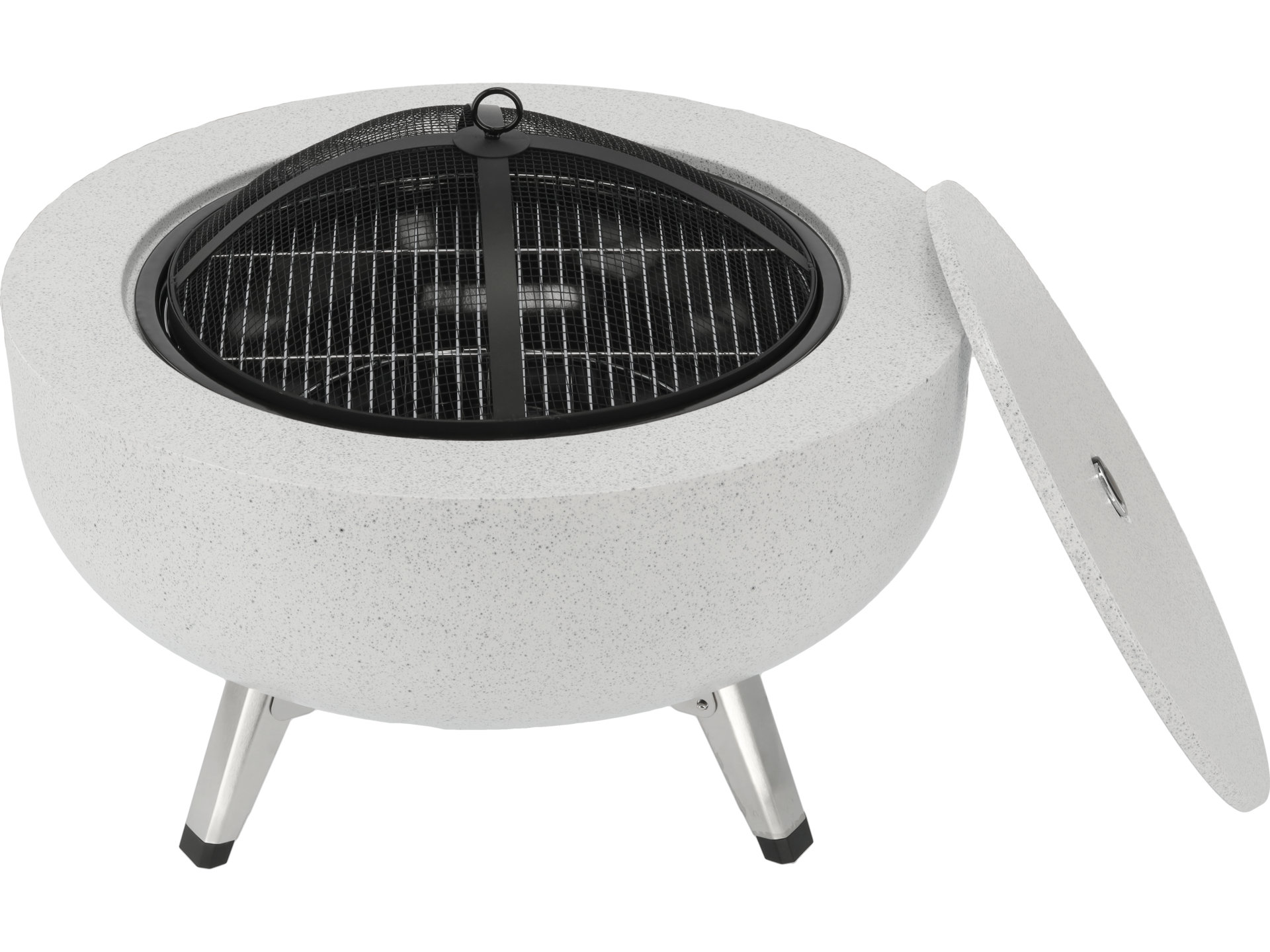 Wielofunkcyjne palenisko ogrodowe łączące funkcje paleniska, grilla węglowego i stolika ogrodowego. Konstrukcja ze stali malowanej proszkowo z chromowanym rusztem grillowym o średnicy 43,5 cm, składanymi nogami i pokrywą ochronną.
