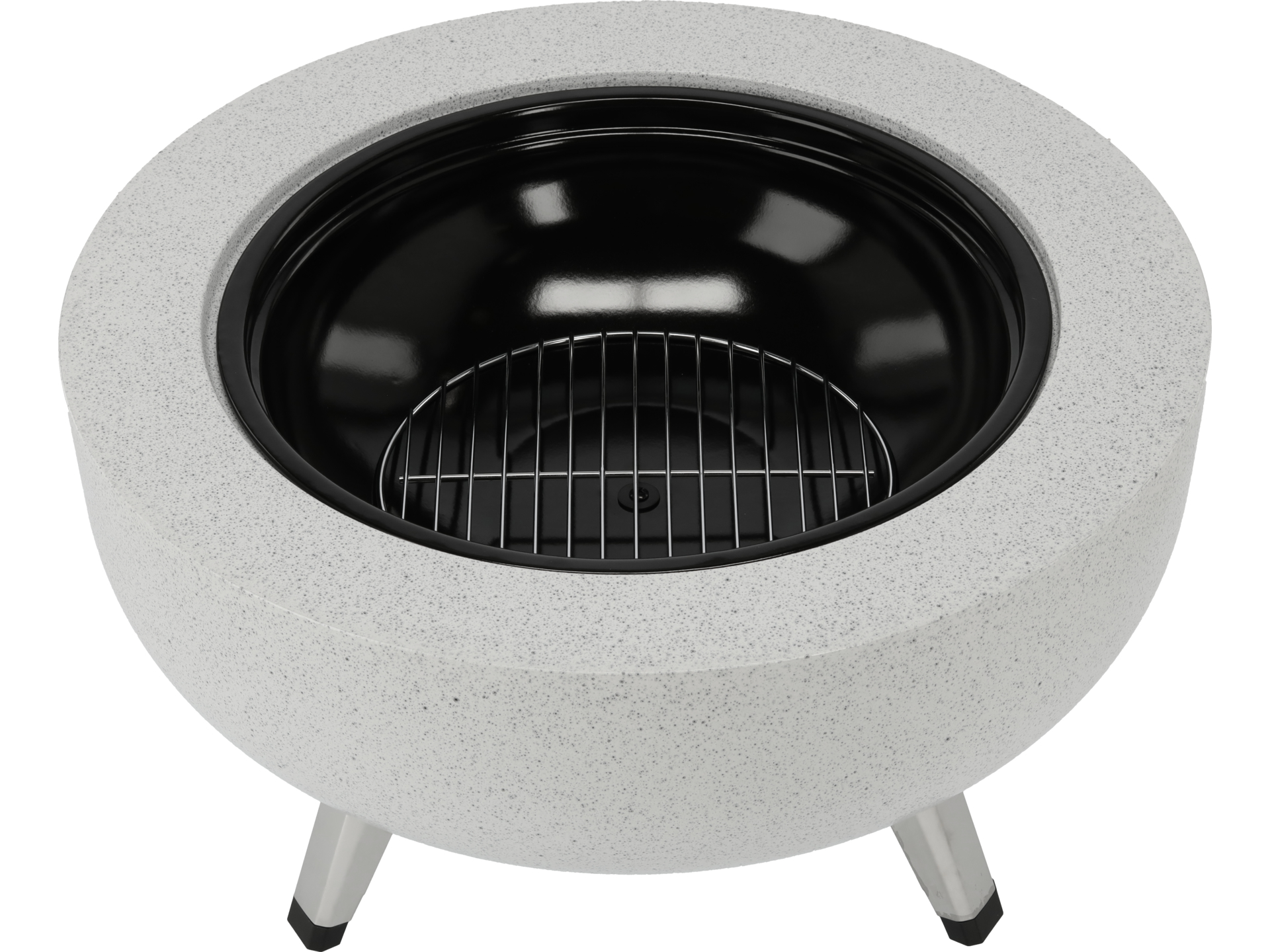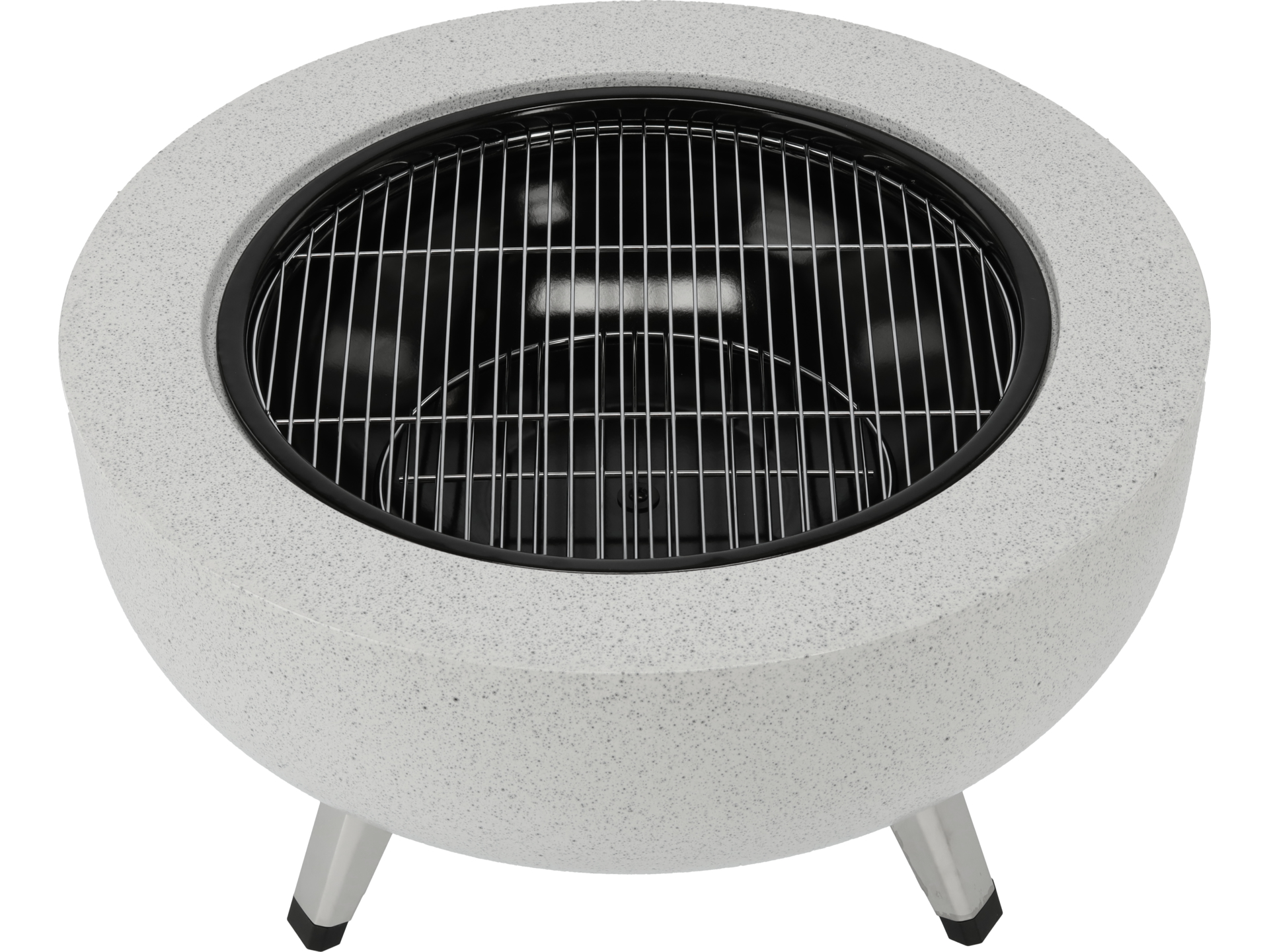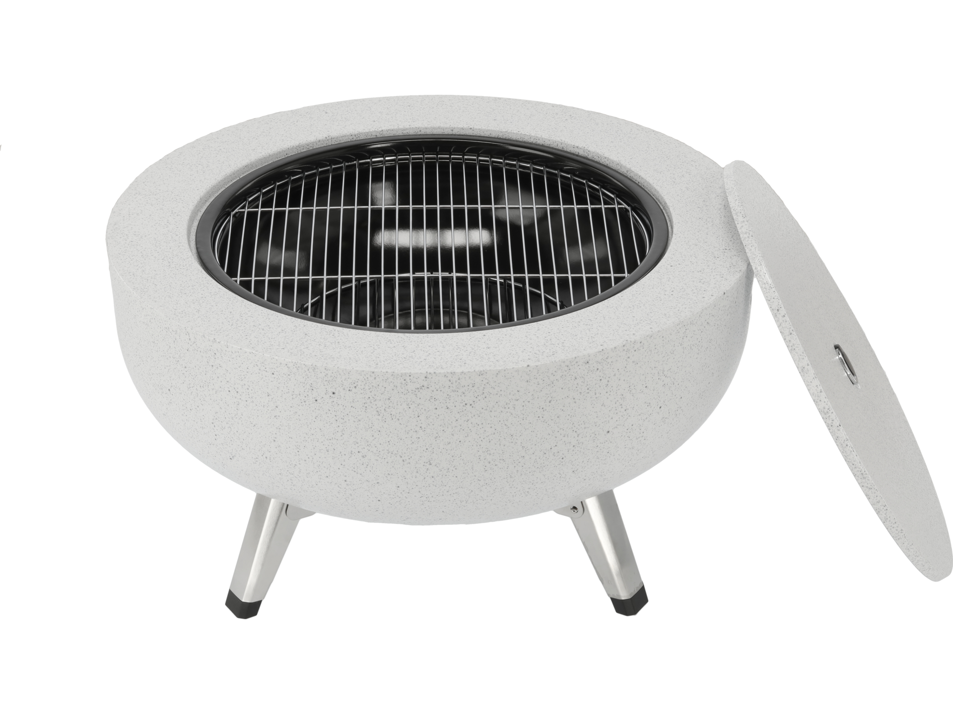 Wielofunkcyjne palenisko ogrodowe łączące funkcje paleniska, grilla węglowego i stolika ogrodowego. Konstrukcja ze stali malowanej proszkowo z chromowanym rusztem grillowym o średnicy 43,5 cm, składanymi nogami i pokrywą ochronną.