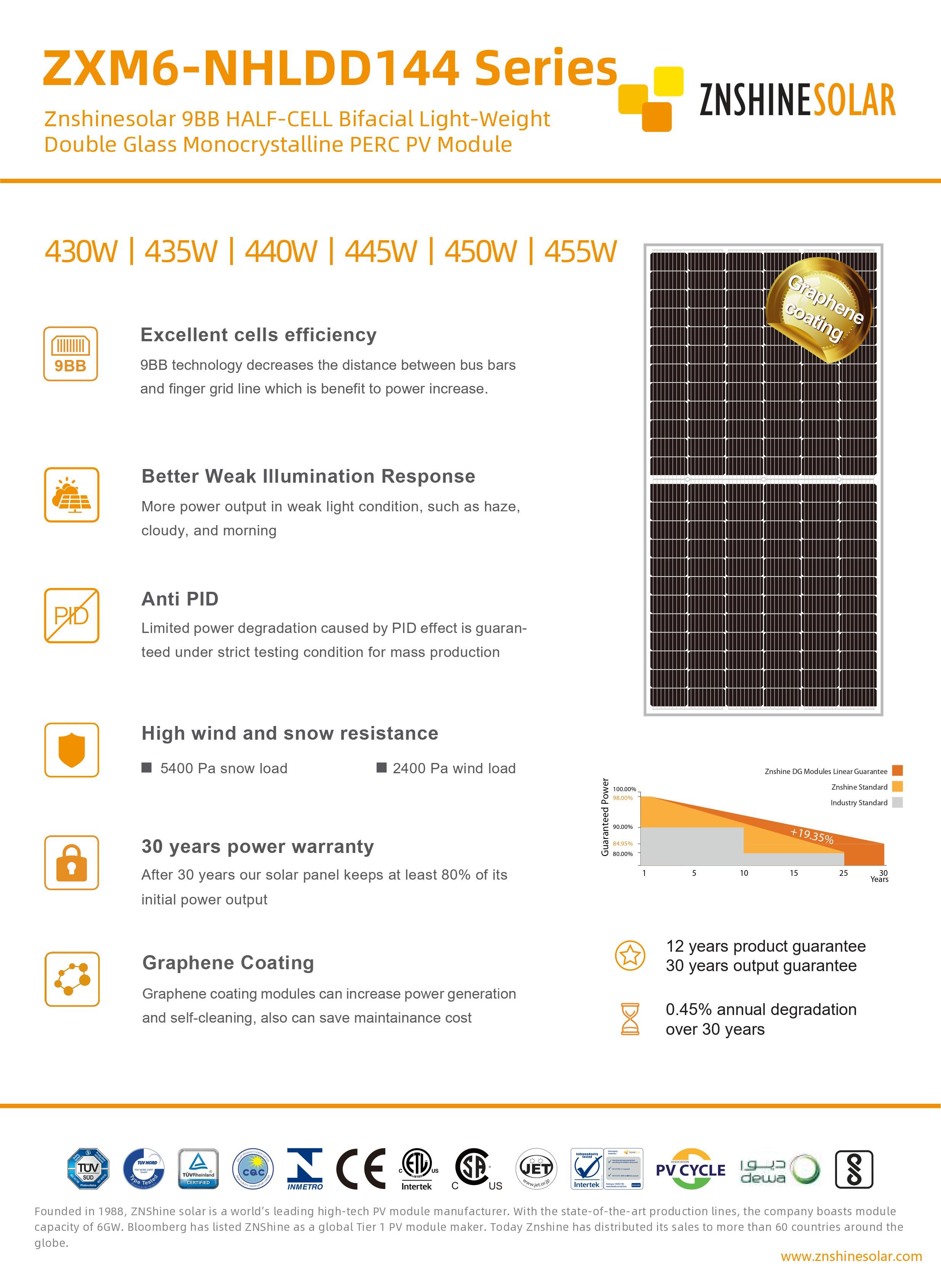 Dwustronny moduł fotowoltaiczny Znshine ZS455W-CZ Bifacial to panel klasy monokrystalicznej z technologią bifacial, umożliwiającą generowanie energii elektrycznej zarówno z promieniowania bezpośredniego (od przodu), jak i odbitego (od tyłu modułu). Przeznaczony do instalacji naziemnych, dachowych i agrofotowoltaicznych, gdzie warunki montażu pozwalają na wykorzystanie promieniowania odbitego od podłoża lub otoczenia.