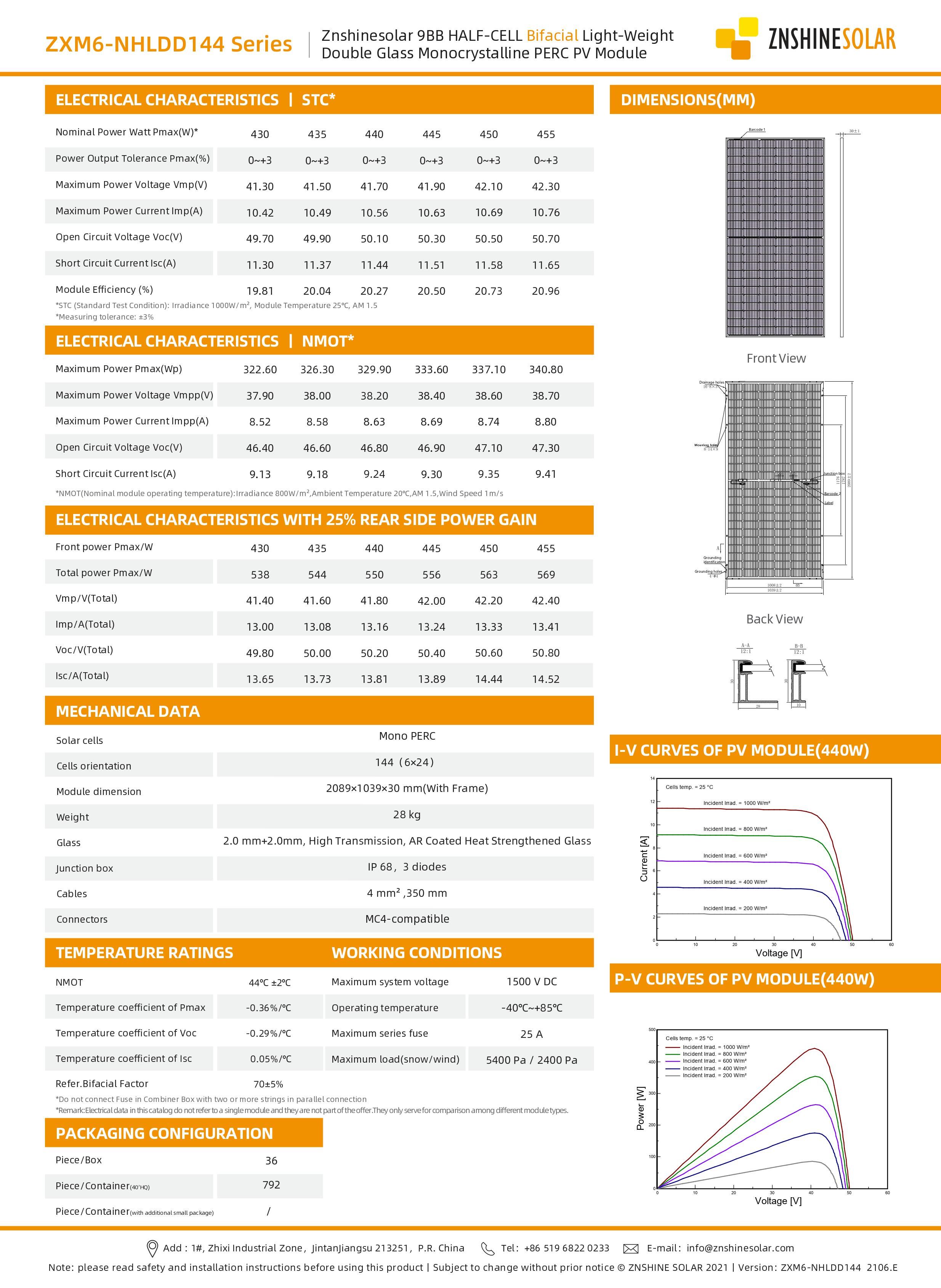 Poniższa tabela zawiera dostępne dane techniczne modułu ZS455W-CZ Bifacial. Parametry STC (Standard Test Conditions) są mierzone przy natężeniu promieniowania 1000 W/m², temperaturze ogniwa 25°C i masie powietrza AM 1,5 — są to warunki laboratoryjne, służące do porównywania modułów między sobą.