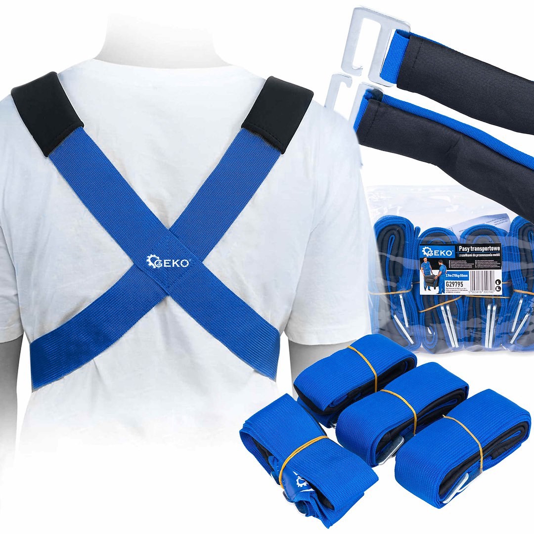 Zestaw 4 pasów transportowych przeznaczonych do ręcznego przenoszenia ciężkich i nieporęcznych przedmiotów — mebli, sprzętu AGD oraz innych ładunków o dużej masie. System składa się z dwóch szelek zakładanych na ramiona lub barki oraz dwóch taśm oplatających przenoszony przedmiot, co zapewnia stabilne utrzymanie ładunku bez konieczności użycia wózka transportowego.