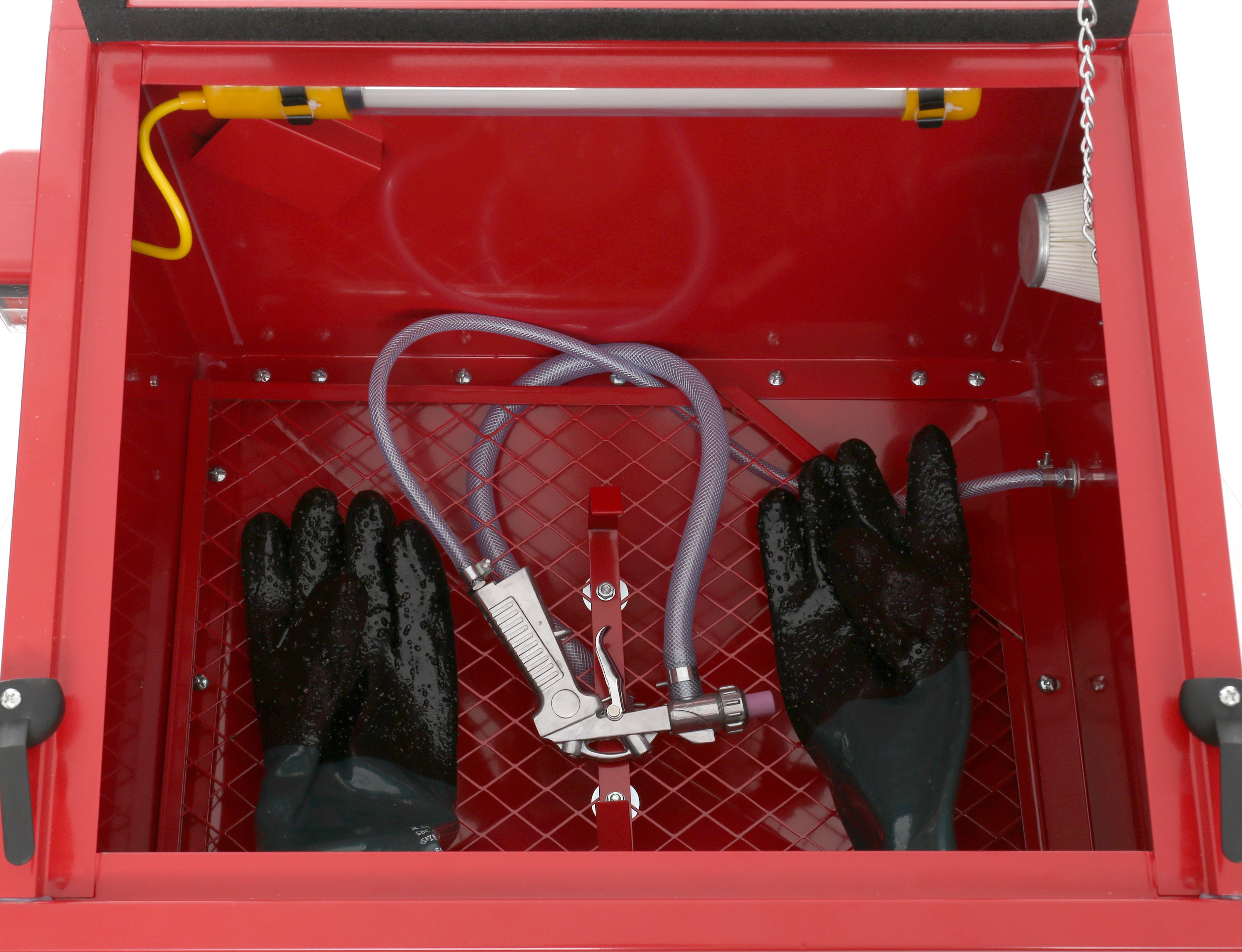 Układ zamknięty z poborem ścierniwa z dna oraz pistolet do piaskowania usprawniają obsługę i sprzyjają utrzymaniu czystości stanowiska.