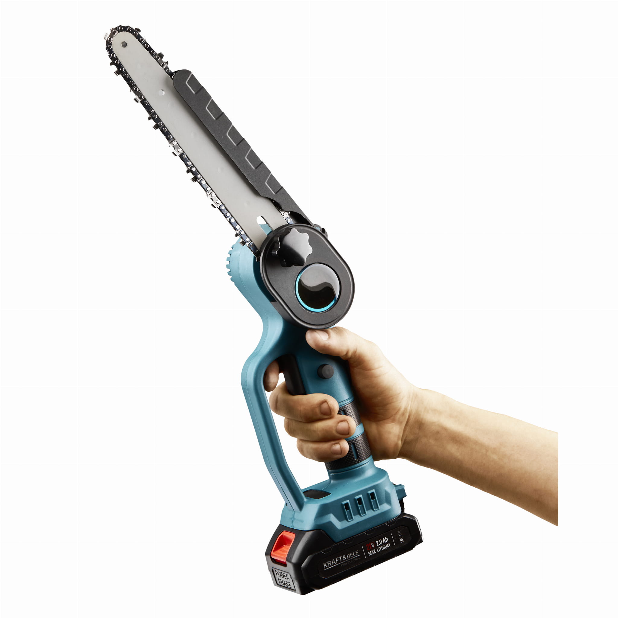 Mini piła łańcuchowa zasilana akumulatorem 21V przeznaczona do prac ogrodowych — przycinania gałęzi, podcinania drzew i cięcia drewna o mniejszych przekrojach. Kompaktowa budowa i waga około 3,15 kg pozwalają na swobodną pracę jedną ręką przez dłuższy czas. Zestaw zawiera dwie baterie oraz walizkę transportową.