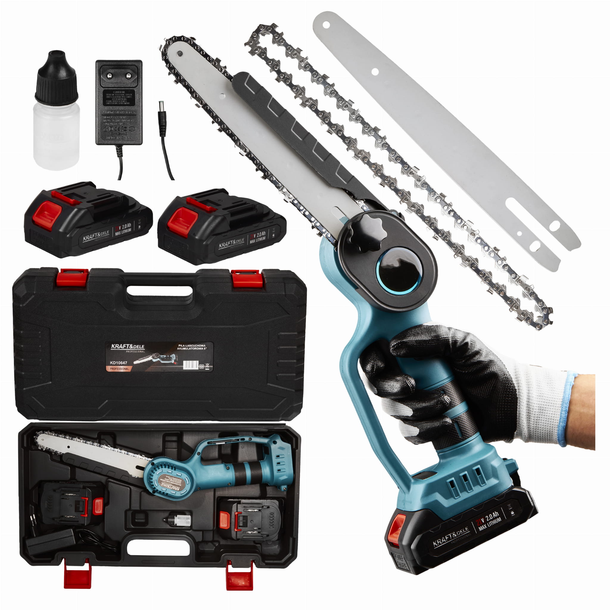 Mini piła akumulatorowa KD10647 • 2 x akumulator 21V / 2,0 Ah • Ładowarka sieciowa 230V • Śrubokręt płaski • Instrukcja obsługi w języku polskim • Walizka transportowa