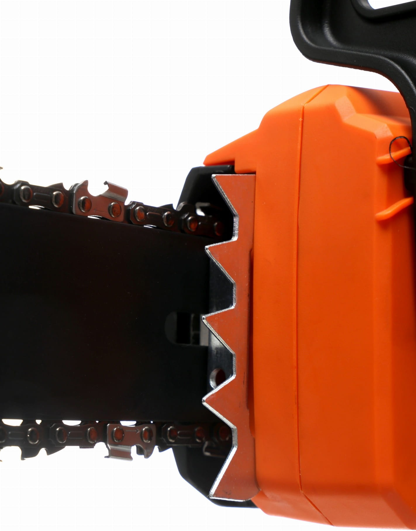 Metalowy mechanizm regulacji naciągu łańcucha zapewnia trwałość i precyzję ustawienia. Metalowy grzebień oporowy stabilizuje piłę względem ciętego materiału, ogranicza drgania i poprawia kontrolę nad narzędziem podczas cięcia pod kątem.