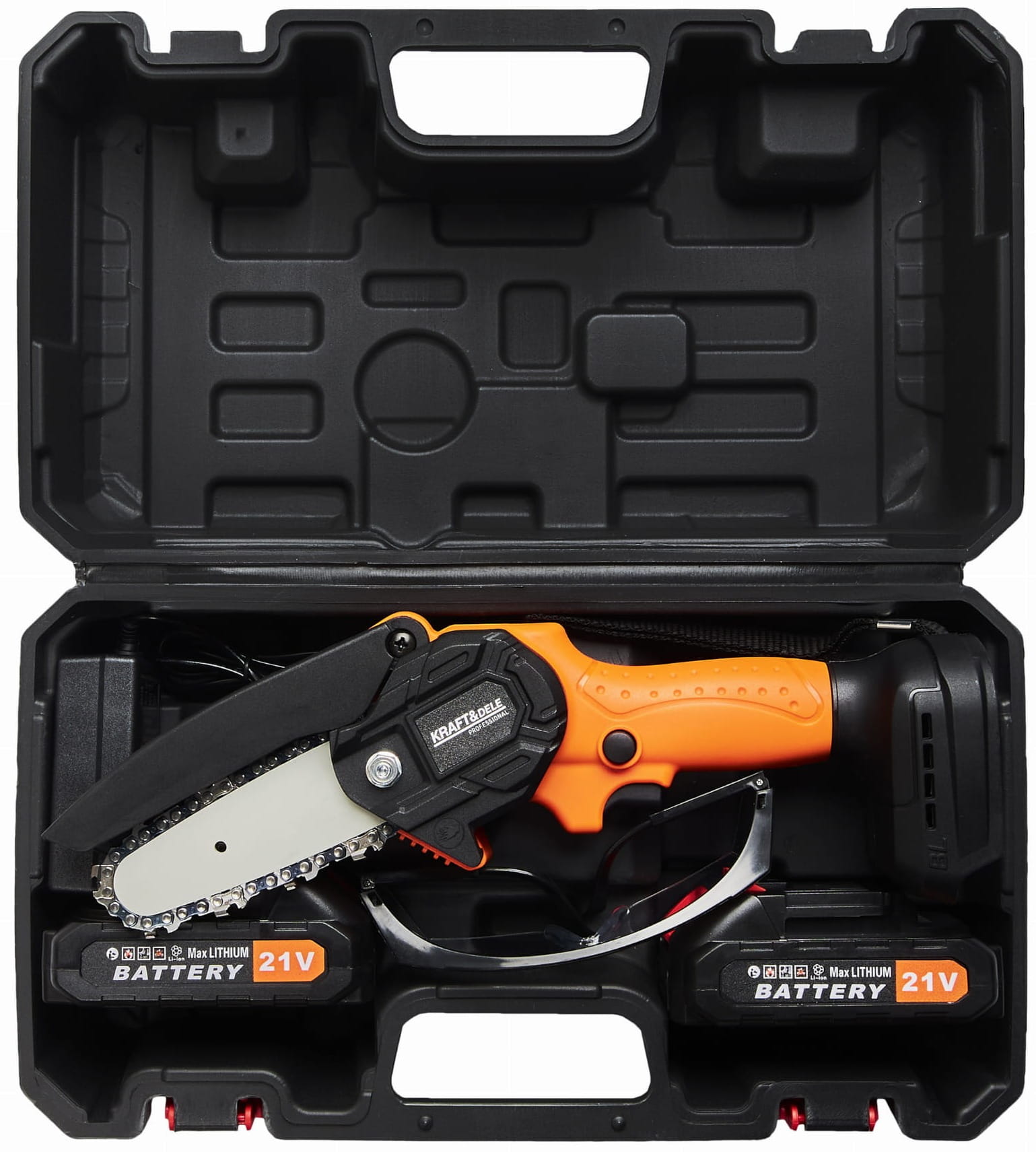 Piła łańcuchowa akumulatorowa, 2 x akumulator 1500 mAh, łańcuch, okulary ochronne, ładowarka do akumulatorów, narzędzia do naciągania łańcucha, walizka transportowa.
