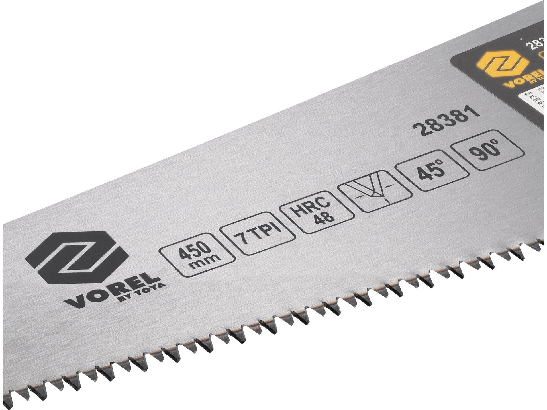 Szukasz wydajnej i precyzyjnej piły płatnicy do drewna, sklejki, płyt wiórowych i innych materiałów drewnopochodnych? Piła płatnica VOREL 28381 o długości 450 mm z innowacyjnym, trójstronnie ostrzonym i hartowanym uzębieniem to idealne narzędzie dla Ciebie. Zapewnia szybkie i agresywne cięcie w obu kierunkach, znacznie skracając czas pracy. Ergonomiczna rękojeść ułatwia pewny chwyt i precyzyjne prowadzenie, a dodatkowe funkcje, takie jak możliwość trasowania kąta 45° i 90°, zwiększają jej wszechstronność.