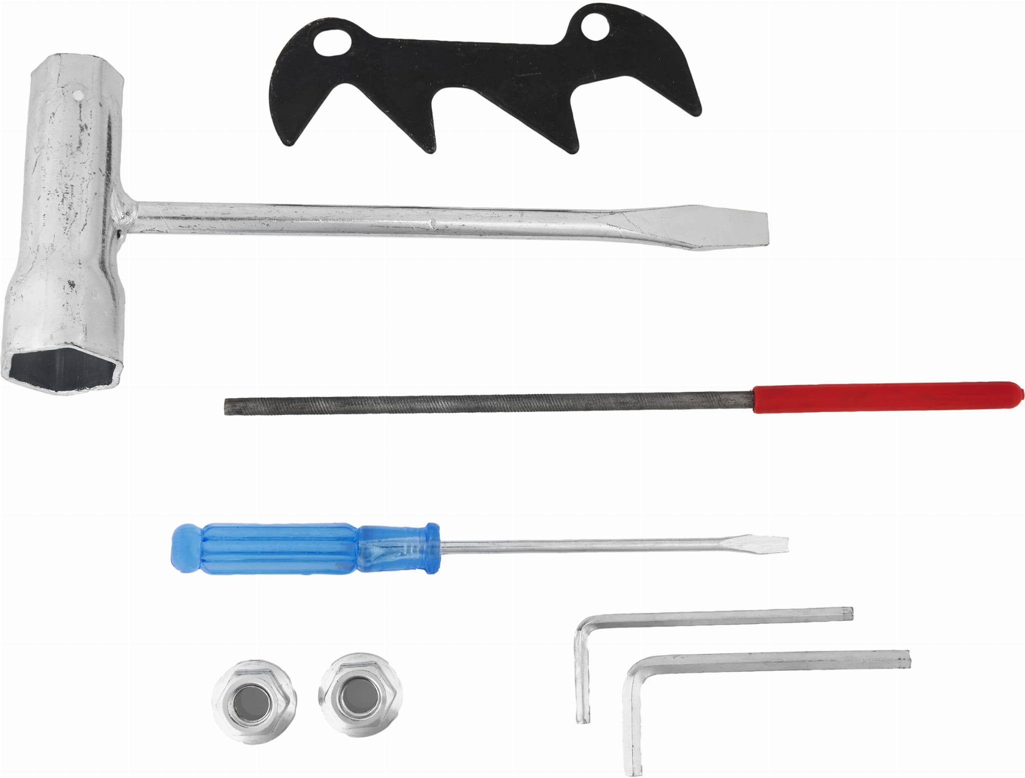 Łańcuch o skoku 3/8" należy regularnie ostrzyć pilnikiem (dołączonym do zestawu) oraz kontrolować jego naciąg. Zbyt luźny łańcuch może zejść z prowadnicy, zbyt napięty — powoduje nadmierne tarcie i skraca żywotność obu elementów. Napięcie reguluje się kluczem dołączonym w zestawie narzędzi.