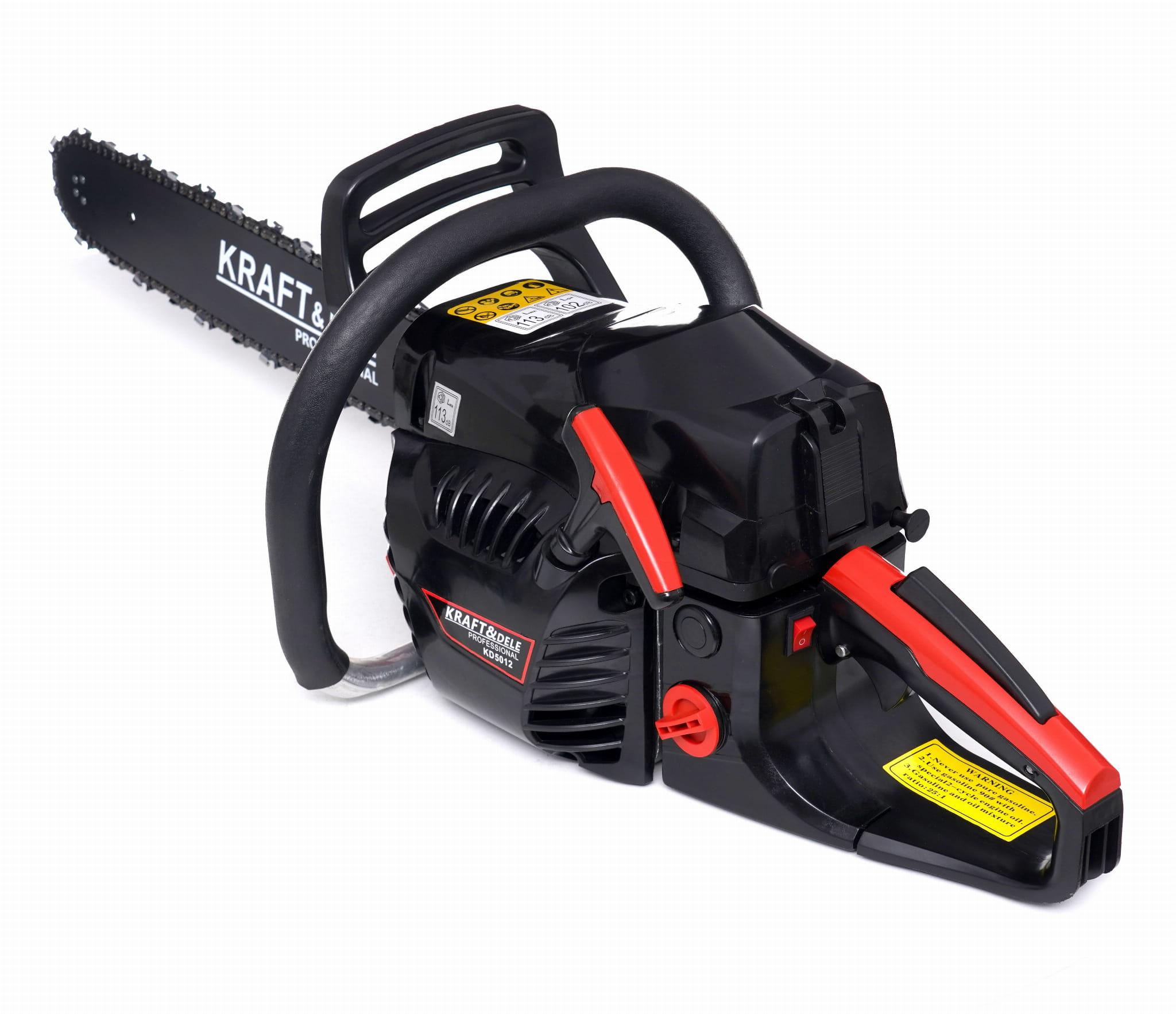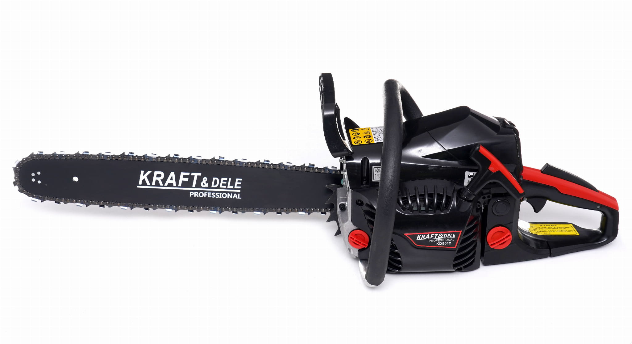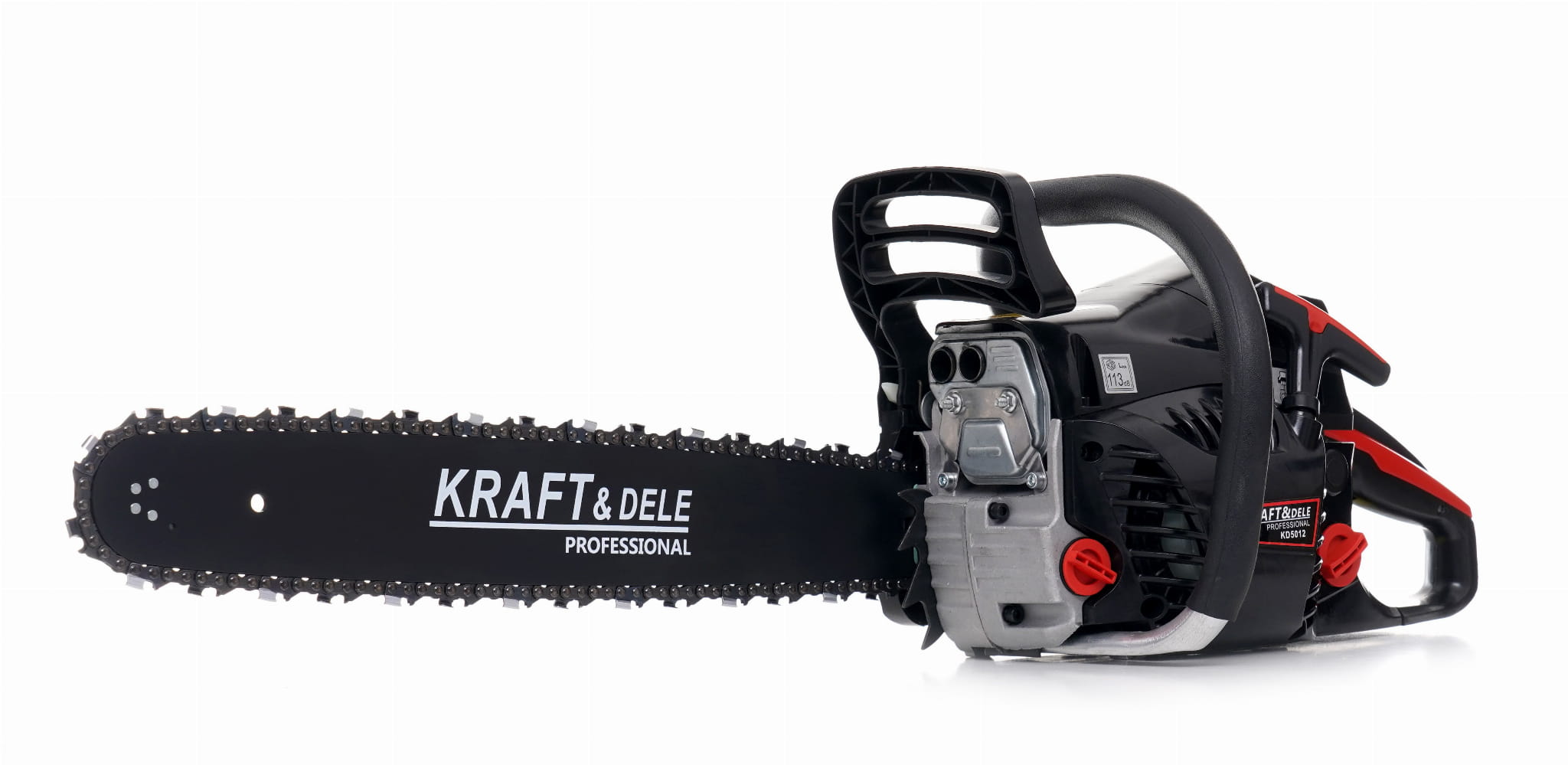 Piła łańcuchowa spalinowa KD5012, osłona prowadnicy, zestaw kluczy (klucz do świec, klucz do prowadnicy, wkrętak, imbusy), zbiornik do mieszania oleju z benzyną, pilnik, łańcuch, prowadnica 50 cm.