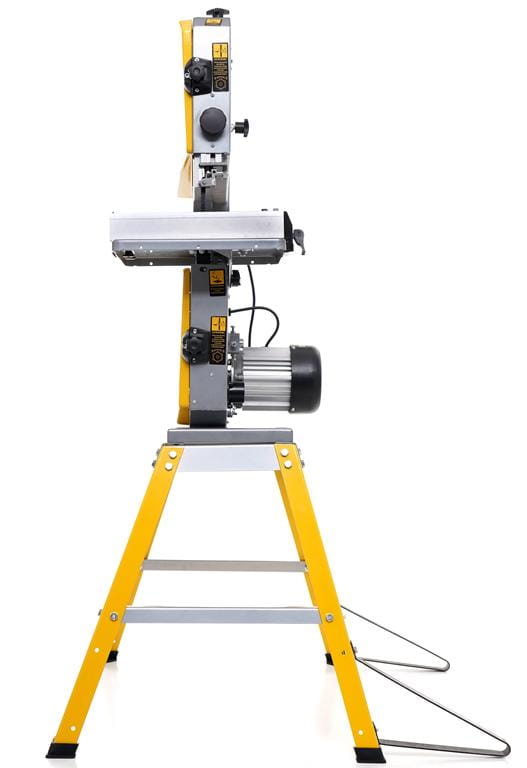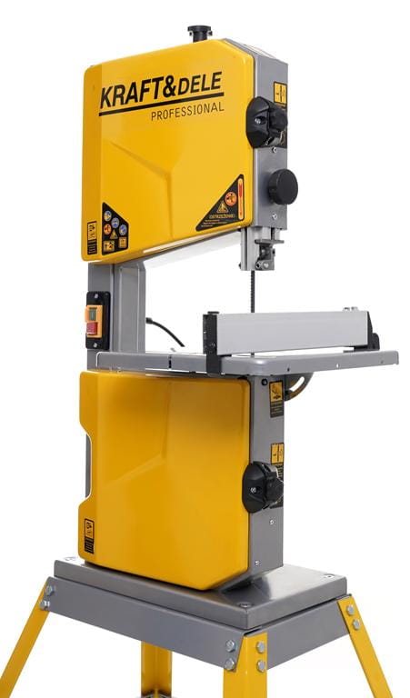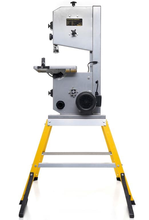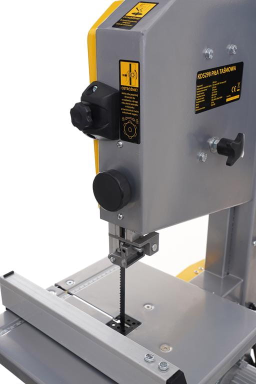 Stołowa piła taśmowa do drewna z silnikiem 900W, przeznaczona do cięcia prostego, ukośnego i krzywoliniowego. W zestawie znajdują się cztery ostrza taśmowe dostosowane do różnych rodzajów cięcia. Urządzenie waży 31 kg, co zapewnia stabilność podczas pracy.