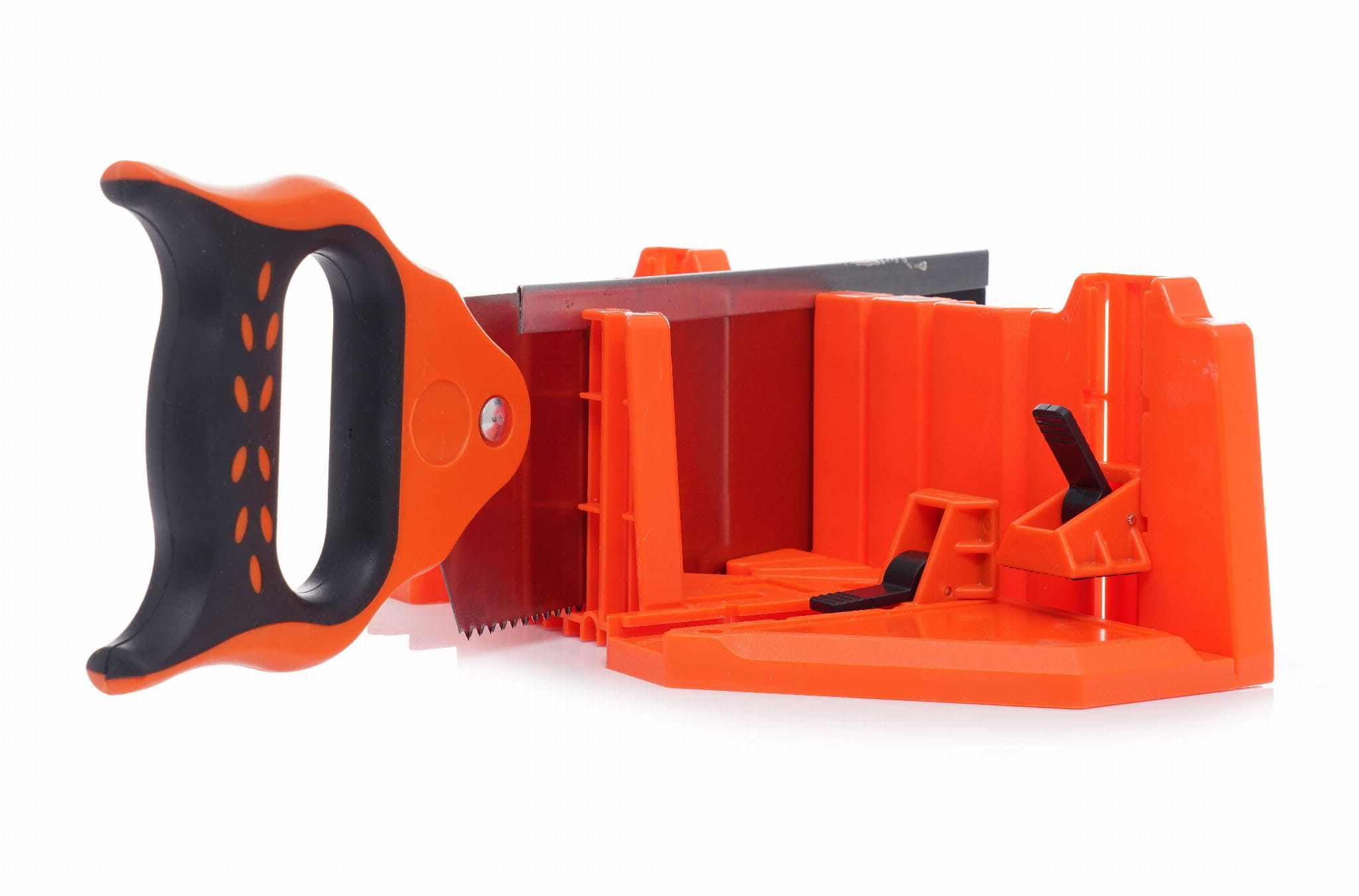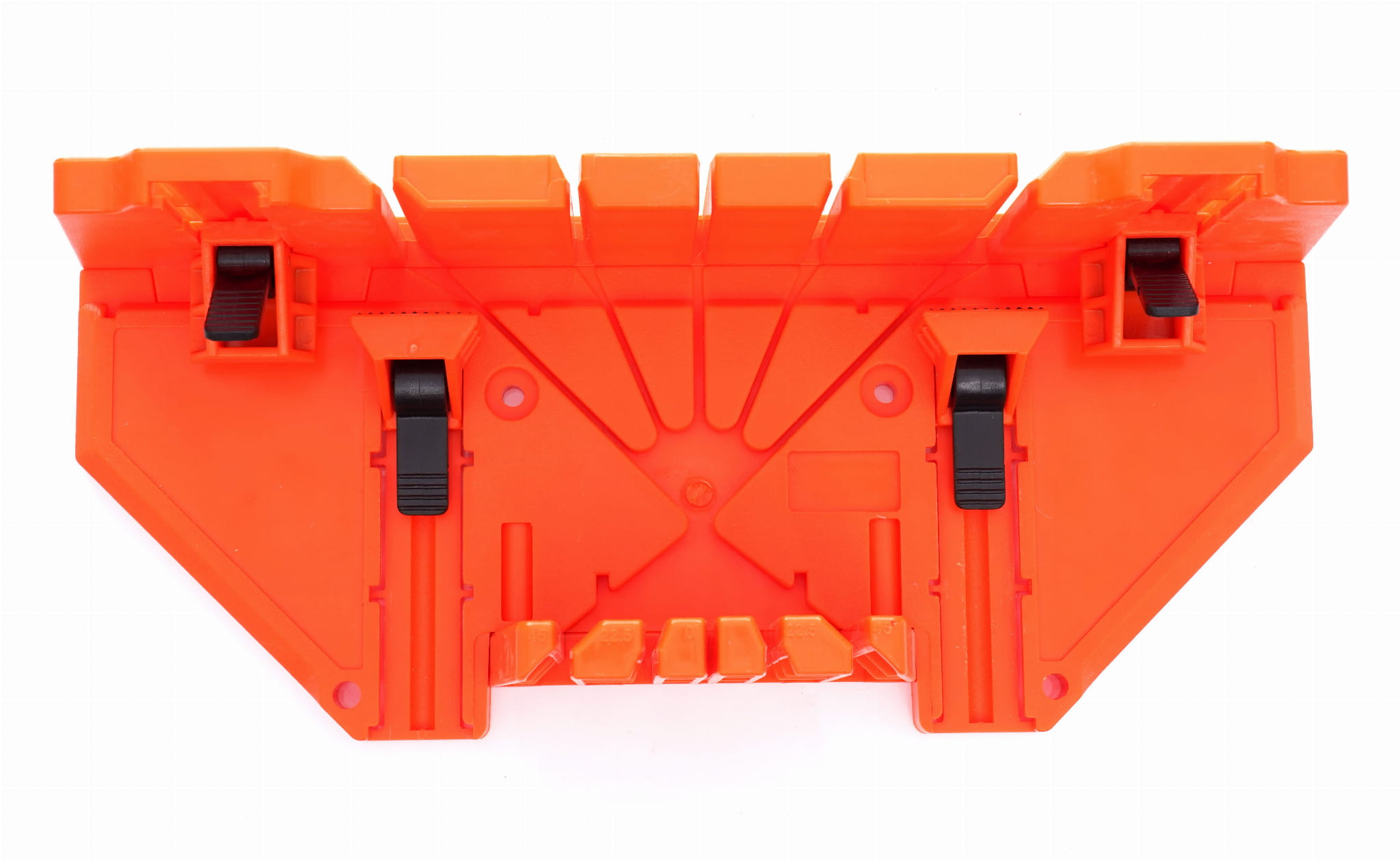 Korpus skrzynki z tworzywa ABS odpornego na uderzenia posiada wbudowane prowadnice ustawione fabrycznie pod kątem 45° i 90°. Prowadnice przejmują funkcję szablonu kąta, eliminując konieczność osobnego odmierzania i kreślenia linii cięcia.