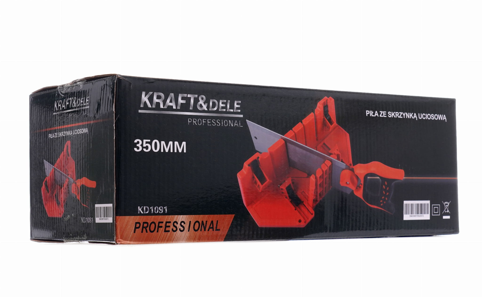 Długość skrzynki (350 mm) określa maksymalną szerokość obrabianego elementu. Przed zakupem należy sprawdzić, czy planowane do cięcia listwy lub deski mieszczą się w tym wymiarze. Model KD1091 obsługuje wyłącznie kąty 45° i 90° — do cięć pod innymi kątami wymagana jest skrzynka z regulowaną prowadnicą lub piła ukośnica.