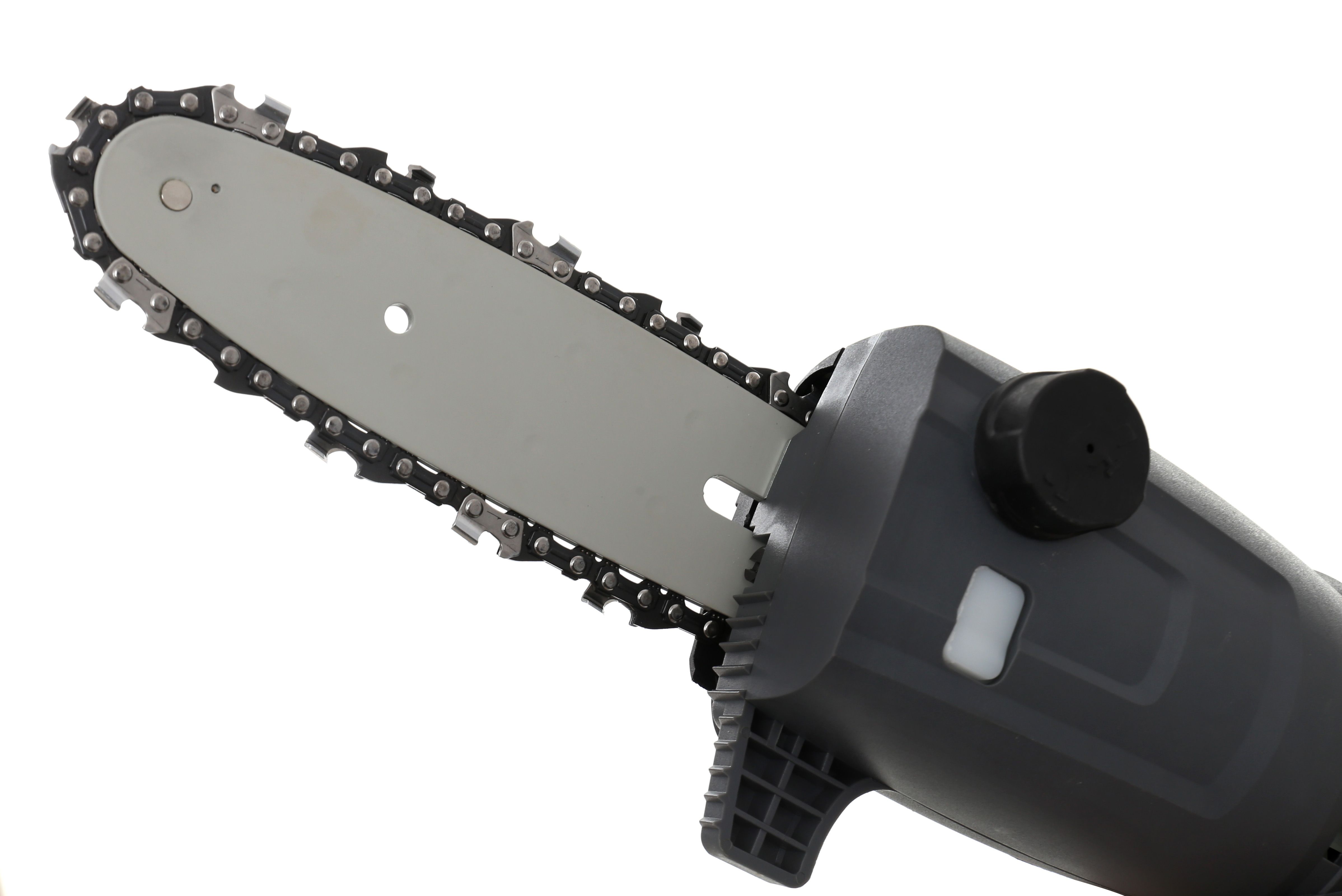 Prowadnica 8" z łańcuchem 3/8" oraz regulacja kąta ułatwiają precyzyjne podcinanie gałęzi i prowadzenie narzędzia.