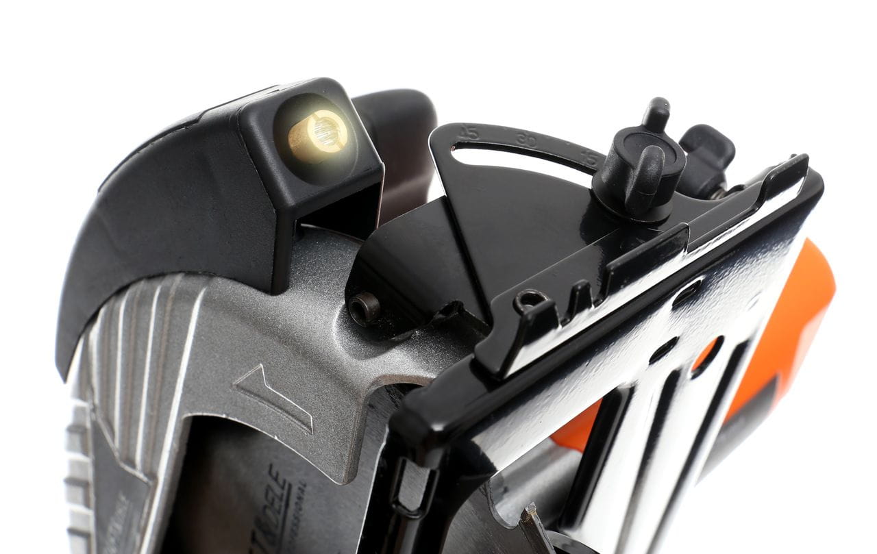 Laser zasilany bateryjnie rzutuje linię na obrabianą powierzchnię, co umożliwia prowadzenie pilarki wzdłuż zaznaczonego śladu bez konieczności częstego wzrokowego korygowania toru cięcia. Szczególnie przydatne przy dłuższych cięciach bez prowadnicy.