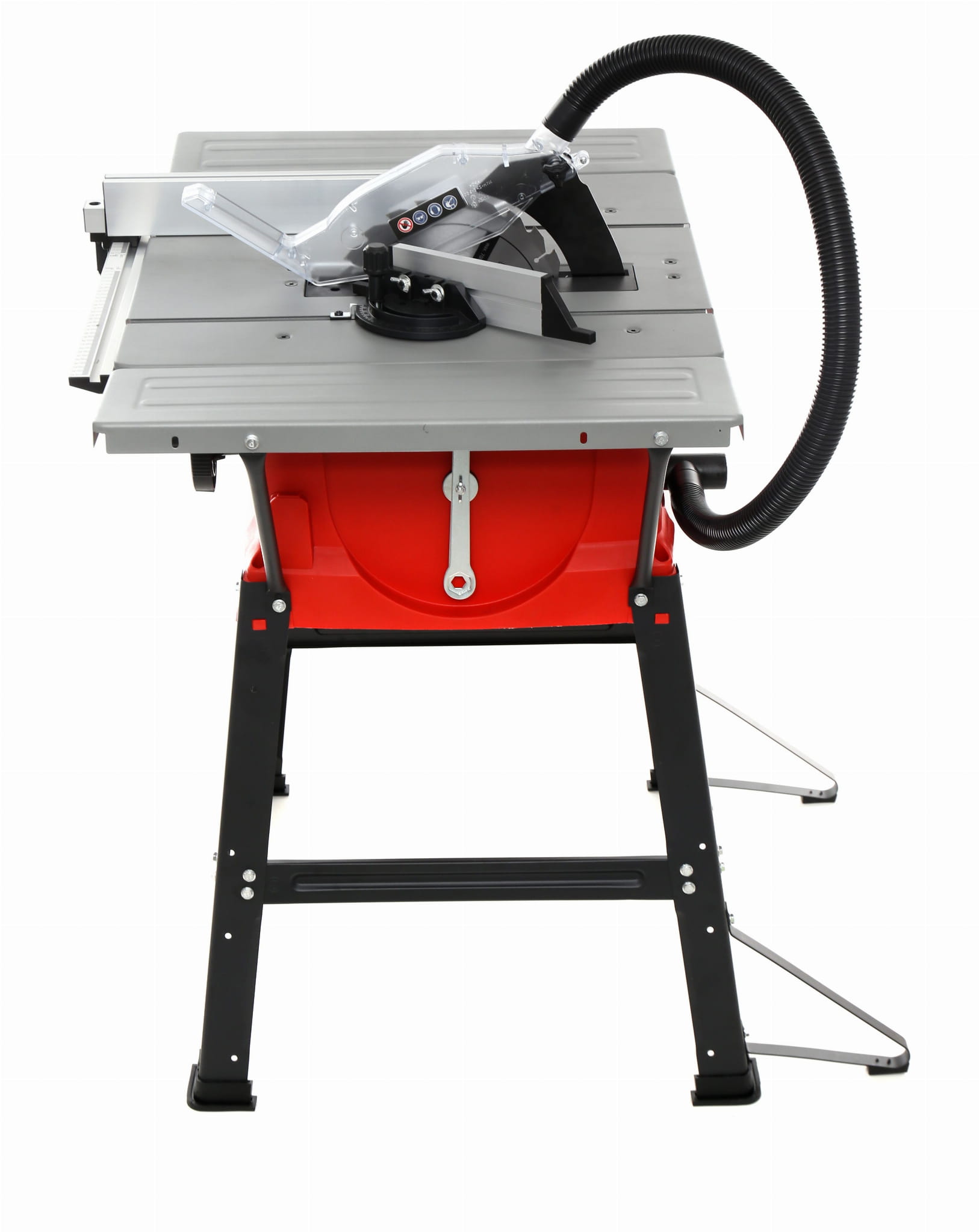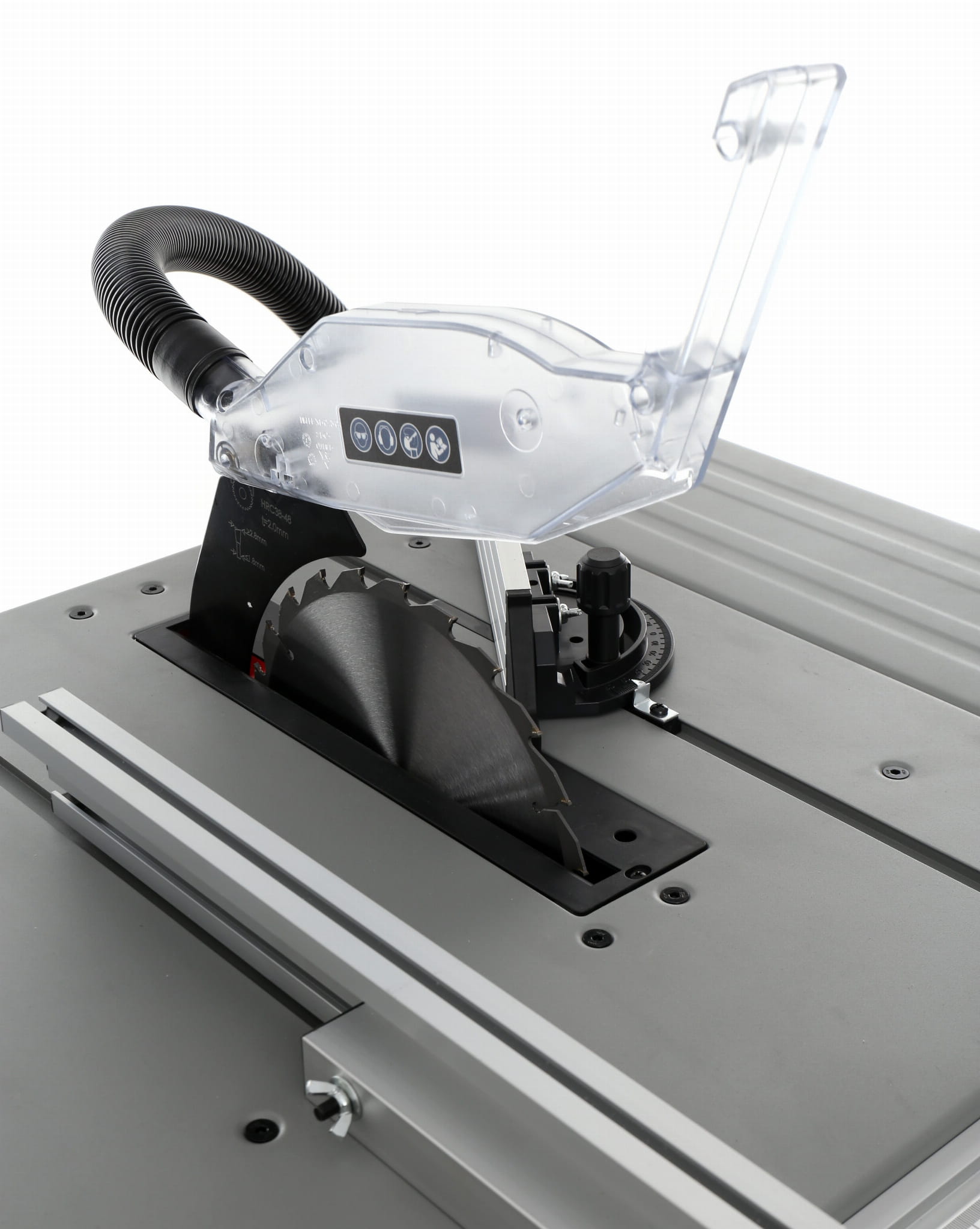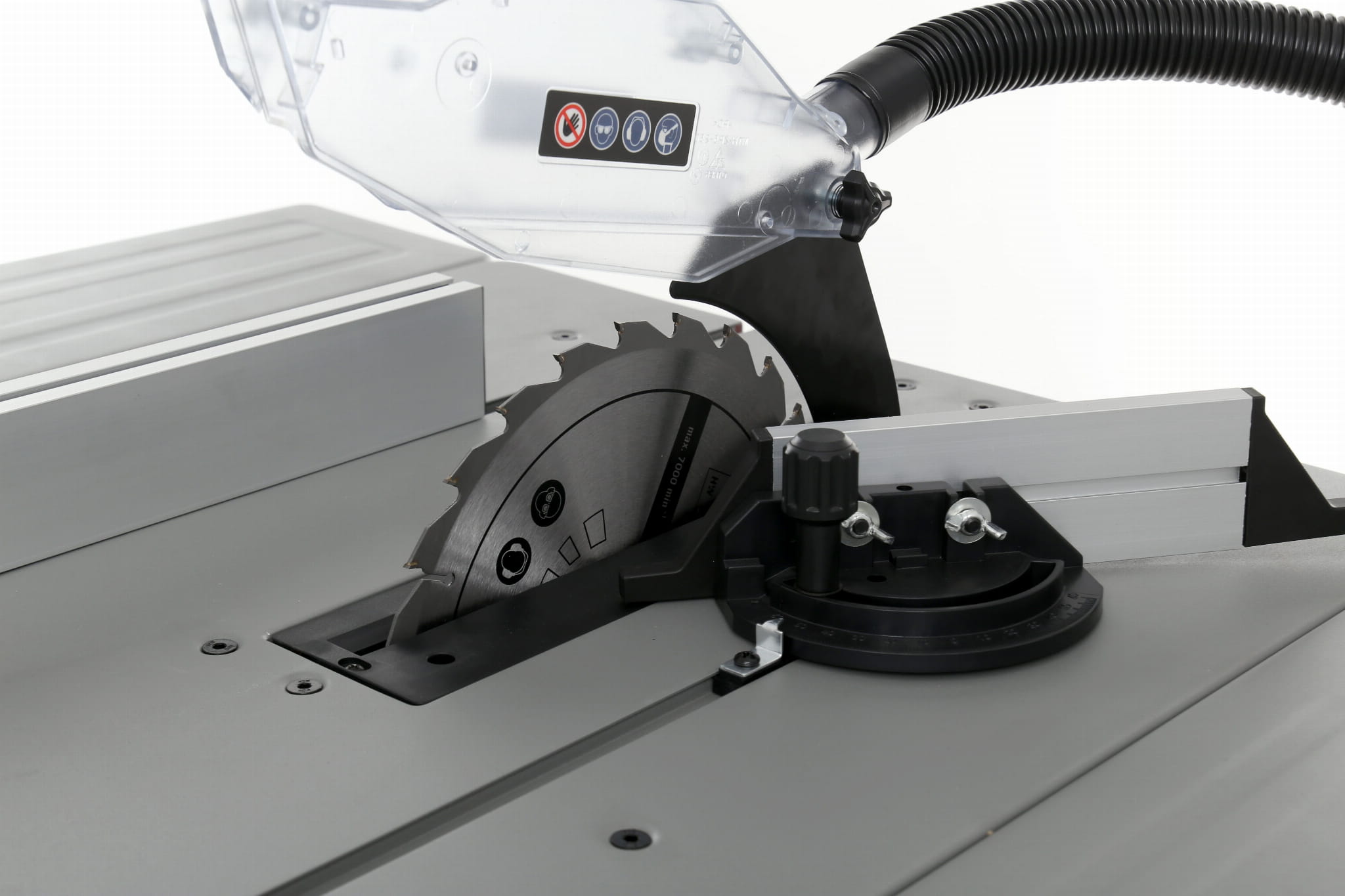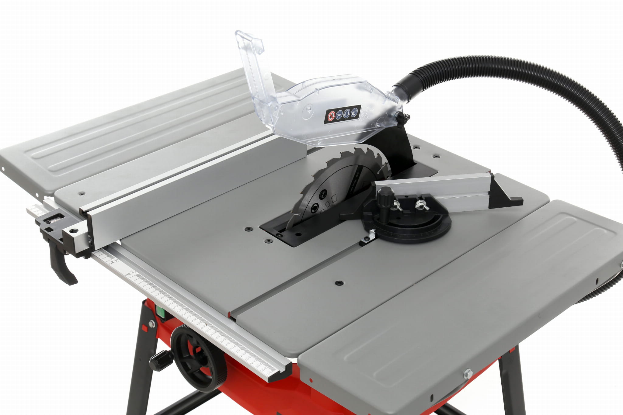 Podstawowy blat o wymiarach 583 x 563 mm można poszerzyć o składane rozszerzenie (583 x 165 mm). Większa powierzchnia podparcia jest istotna przy cięciu długich desek i płyt, ponieważ stabilizuje materiał i zmniejsza ryzyko odchylenia podczas cięcia.