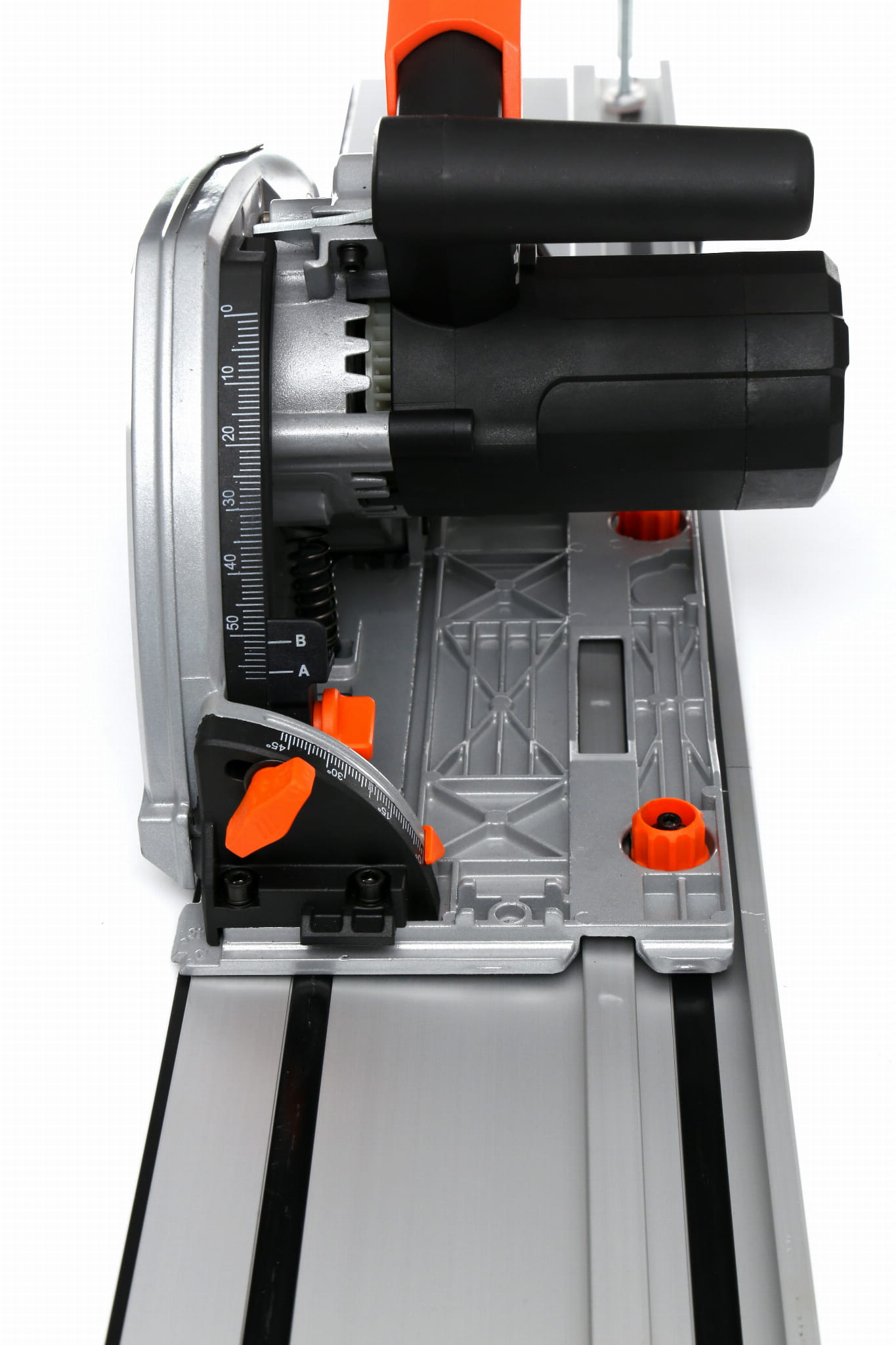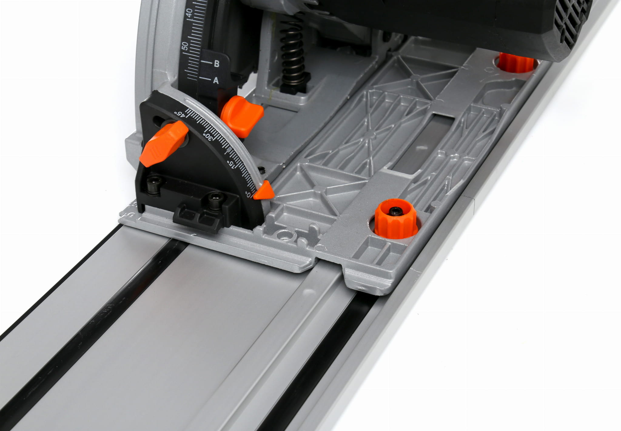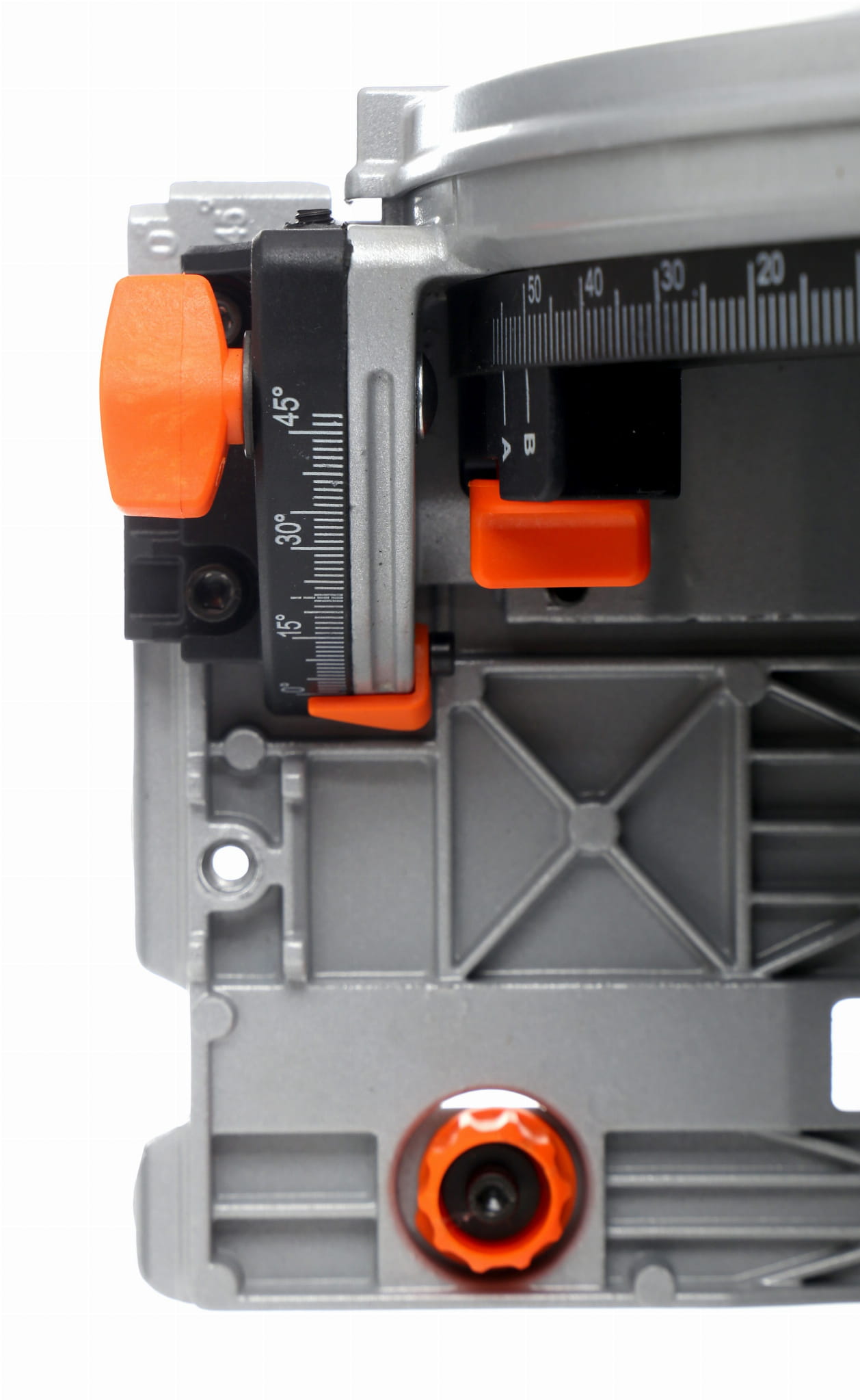 Maksymalna głębokość 57 mm pozwala na cięcie standardowych desek, płyt OSB, MDF oraz sklejki w jednym przejściu. Wartość ta dotyczy cięcia prostopadłego — przy cięciach ukośnych głębokość robocza ulega zmniejszeniu.