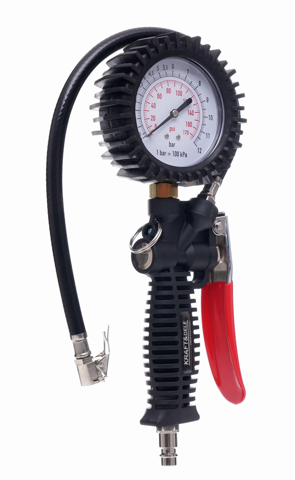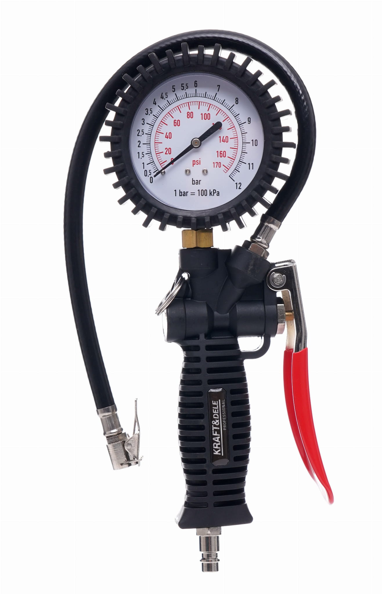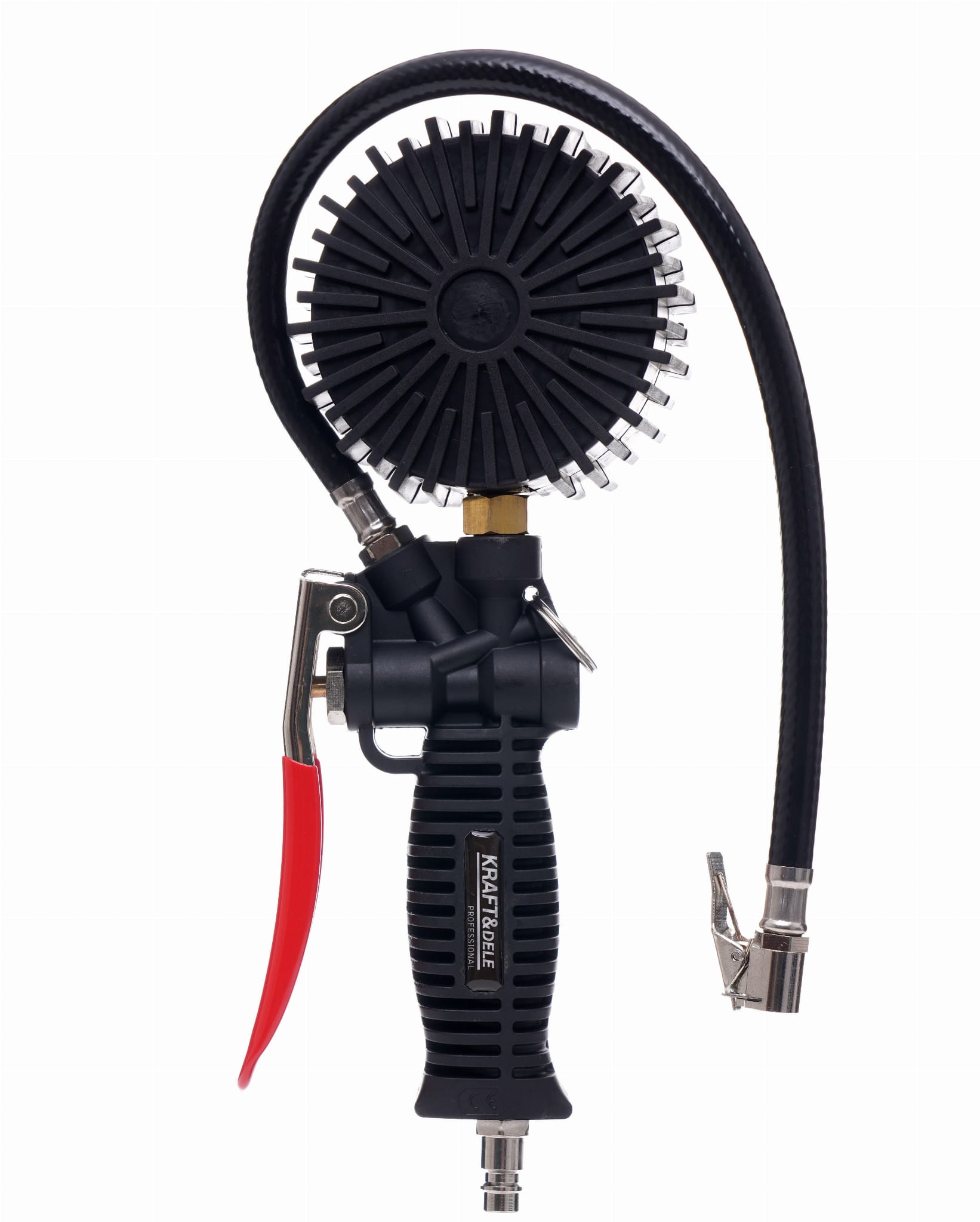 KD1365 to pneumatyczny pistolet do pompowania przeznaczony do pracy z kompresorami sprężonego powietrza. Umożliwia zarówno kontrolę ciśnienia, jak i pompowanie kół samochodowych oraz innych elementów pneumatycznych. Wbudowany manometr pozwala na bieżące odczytywanie ciśnienia bez potrzeby stosowania osobnych przyrządów pomiarowych.