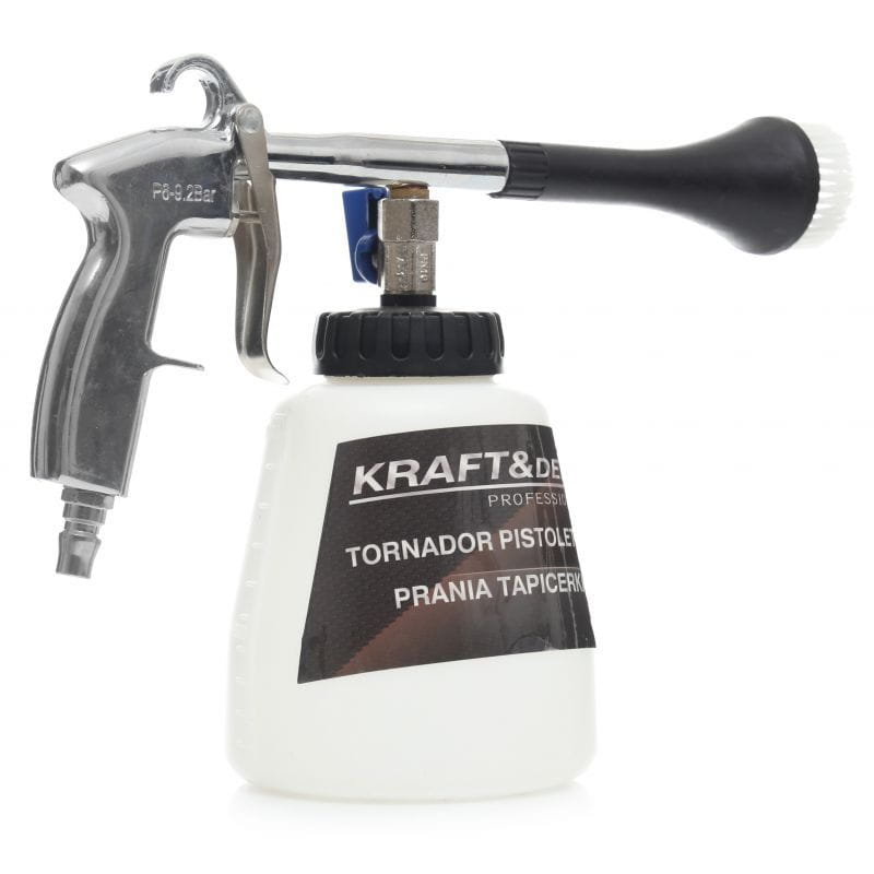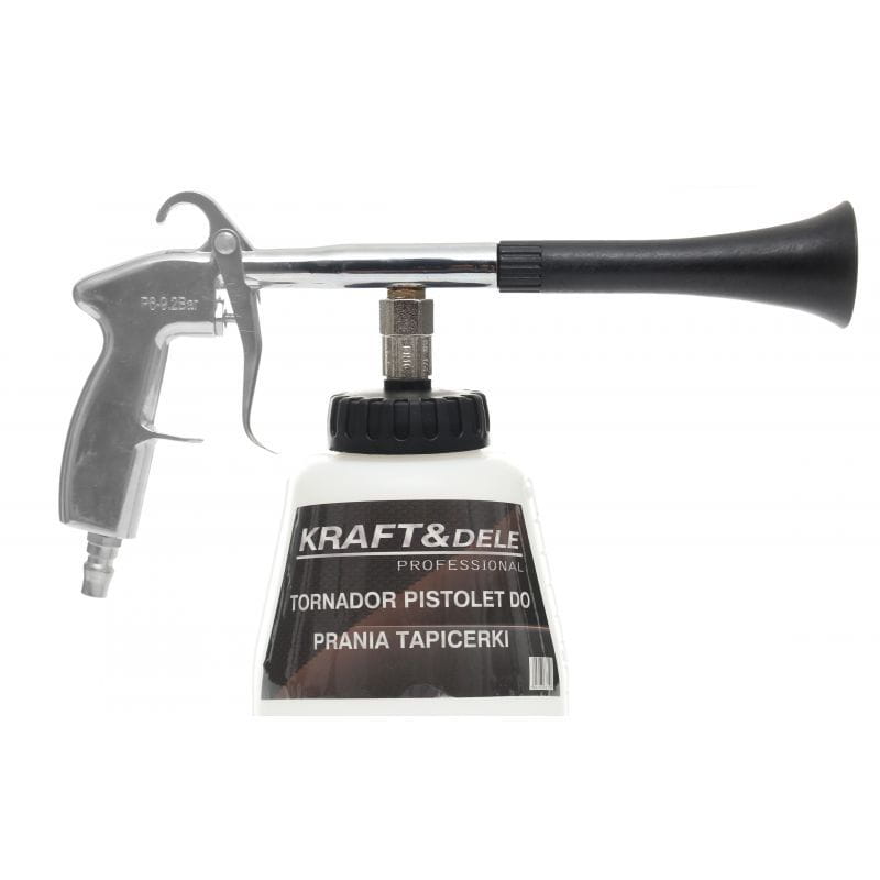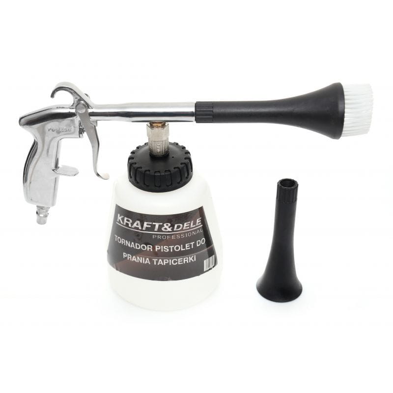 Pneumatyczny pistolet do czyszczenia tapicerki przeznaczony do pracy z kompresorem. Łączy podawanie skoncentrowanego detergentu z regulowanym strumieniem sprężonego powietrza, co pozwala na skuteczne usuwanie zabrudzeń z różnych rodzajów powierzchni tekstylnych i twardych.