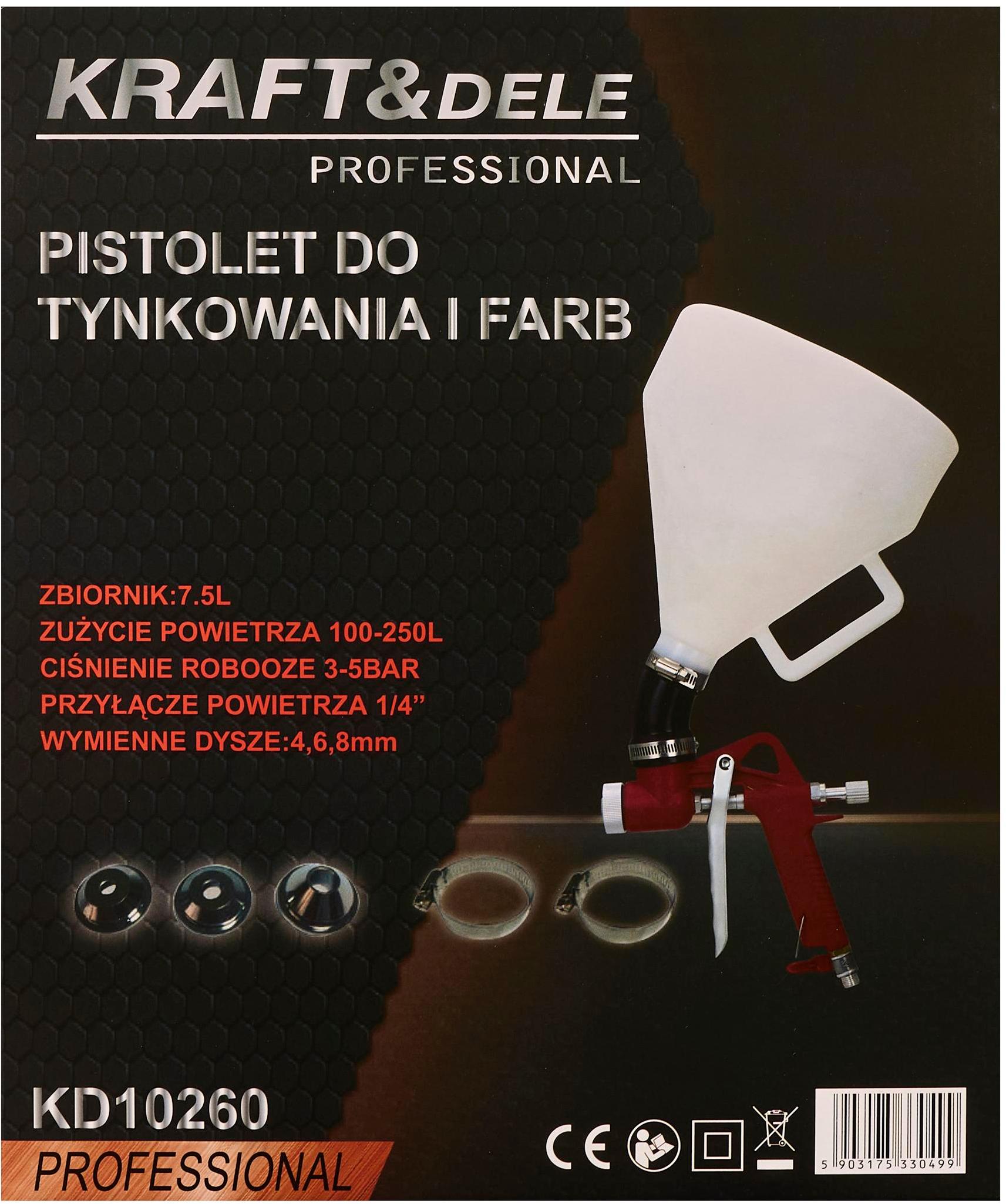 Pistolet KD10260 wymaga sprężarki zdolnej do utrzymania ciśnienia w zakresie 3–5 bar przy wydajności co najmniej 100–250 l/min (w zależności od wybranej dyszy i konsystencji materiału). Złącze 1/4" jest standardem w większości sprężarek warsztatowych i budowlanych — przed zakupem należy sprawdzić typ szybkozłącza stosowanego w posiadanej sprężarce (BSP, Euro, US), ponieważ sam gwint 1/4" może wymagać adaptera.