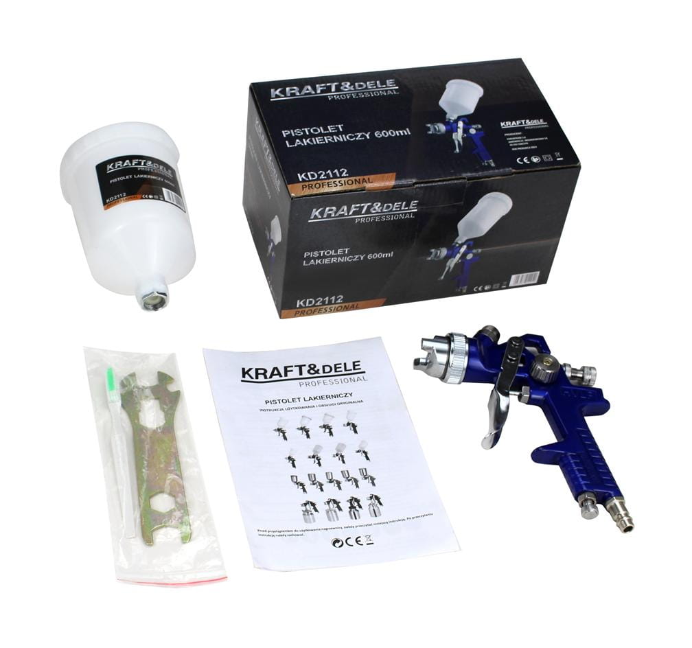 KD2112 to pneumatyczny pistolet lakierniczy z dolnym zbiornikiem o pojemności 600 ml, przeznaczony do nakładania lakierów, podkładów akrylowych, szpachli i powłok metalizowanych. Urządzenie pracuje w zakresie ciśnienia 2,5–4 bar i wymaga podłączenia do sprężarki z odpowiednim wydatkiem powietrza.