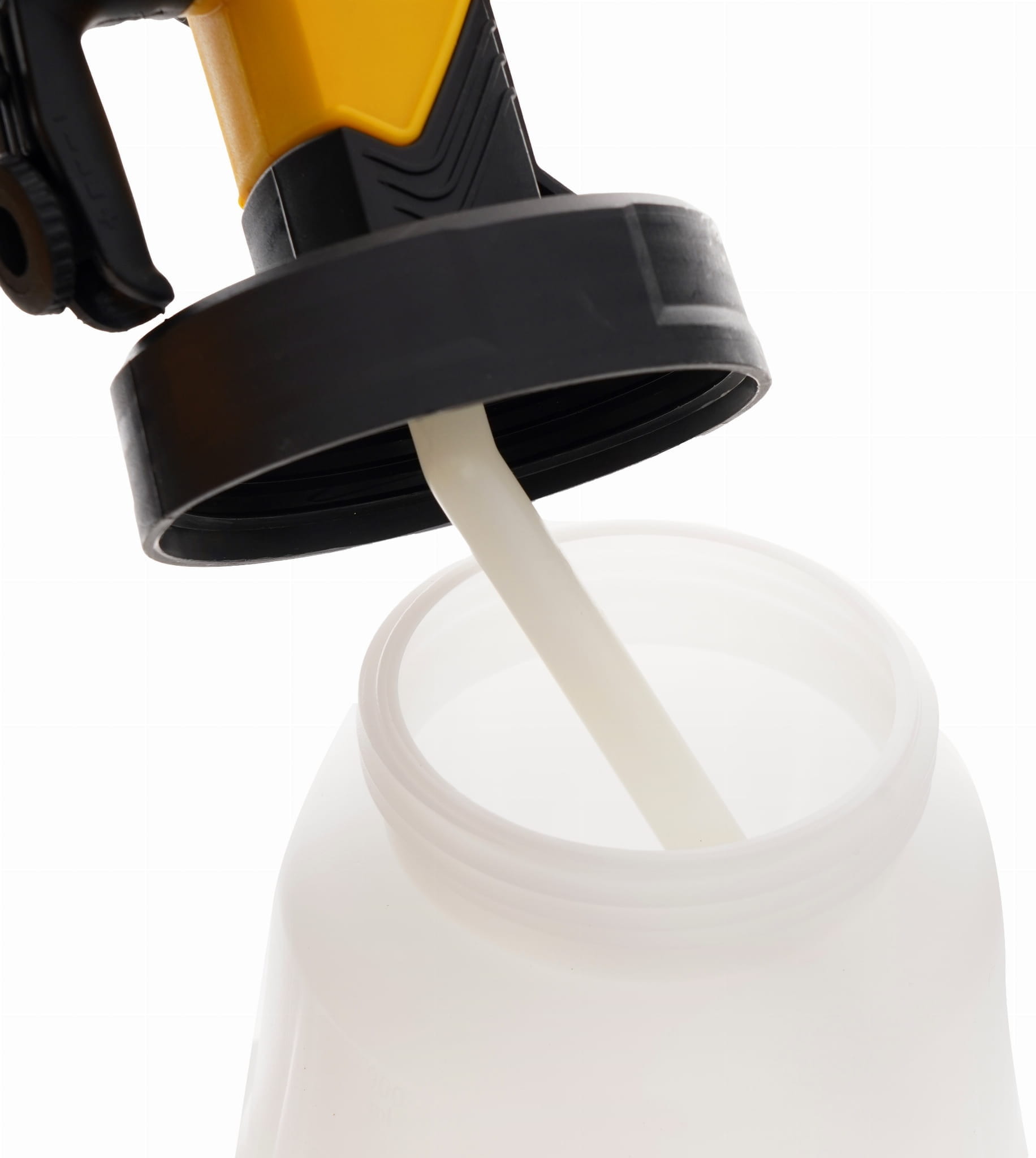 System wysokiego przepływu przy niskim ciśnieniu (0,15–0,35 bar) ogranicza rozpraszanie farby w powietrzu. Oznacza to mniejsze straty materiału w porównaniu z tradycyjnymi pistoletami sprężarkowymi oraz mniejsze zapylenie stanowiska pracy.