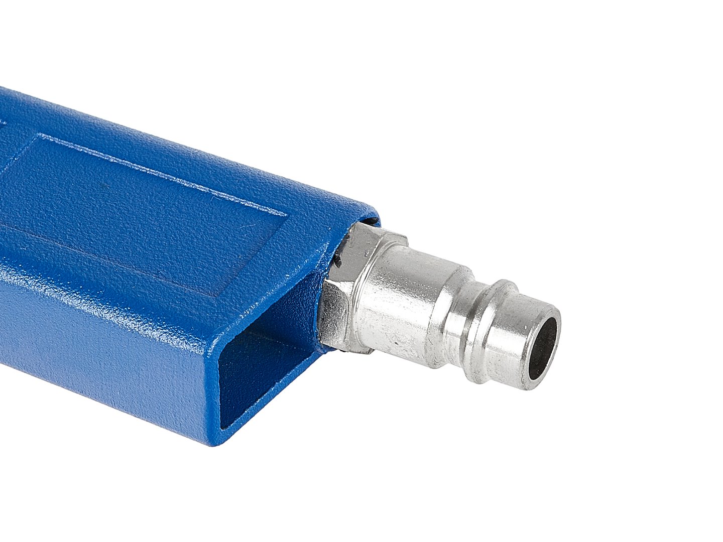 Pistolet do przedmuchiwania sprężonym powietrzem przeznaczony do prac warsztatowych i serwisowych. Zestaw zawiera dwie wymienne dysze — krótką do precyzyjnego przedmuchiwania oraz długą (20 cm) umożliwiającą dotarcie do trudno dostępnych miejsc. Metalowa dźwignia spustowa i przyłącze 1/4" zapewniają kompatybilność ze standardowymi instalacjami sprężonego powietrza.