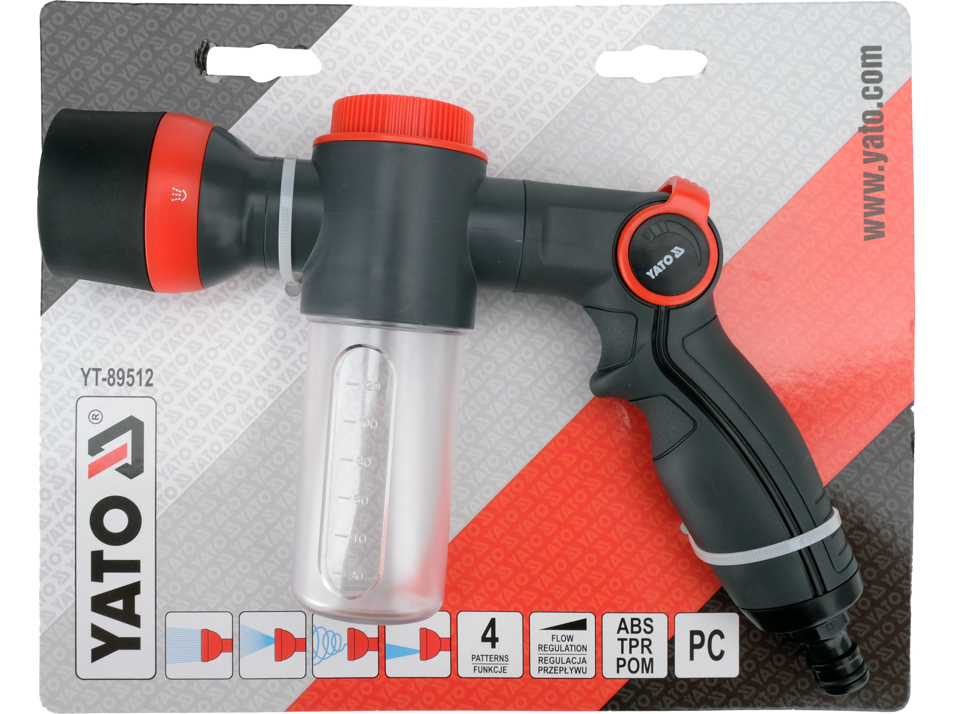 Wielofunkcyjny pistolet zraszający z wbudowanym dozownikiem do nawozów i detergentów. Urządzenie łączy funkcje podlewania, zraszania i mycia z możliwością jednoczesnej aplikacji środków płynnych, eliminując potrzebę osobnego sprzętu do nawożenia.