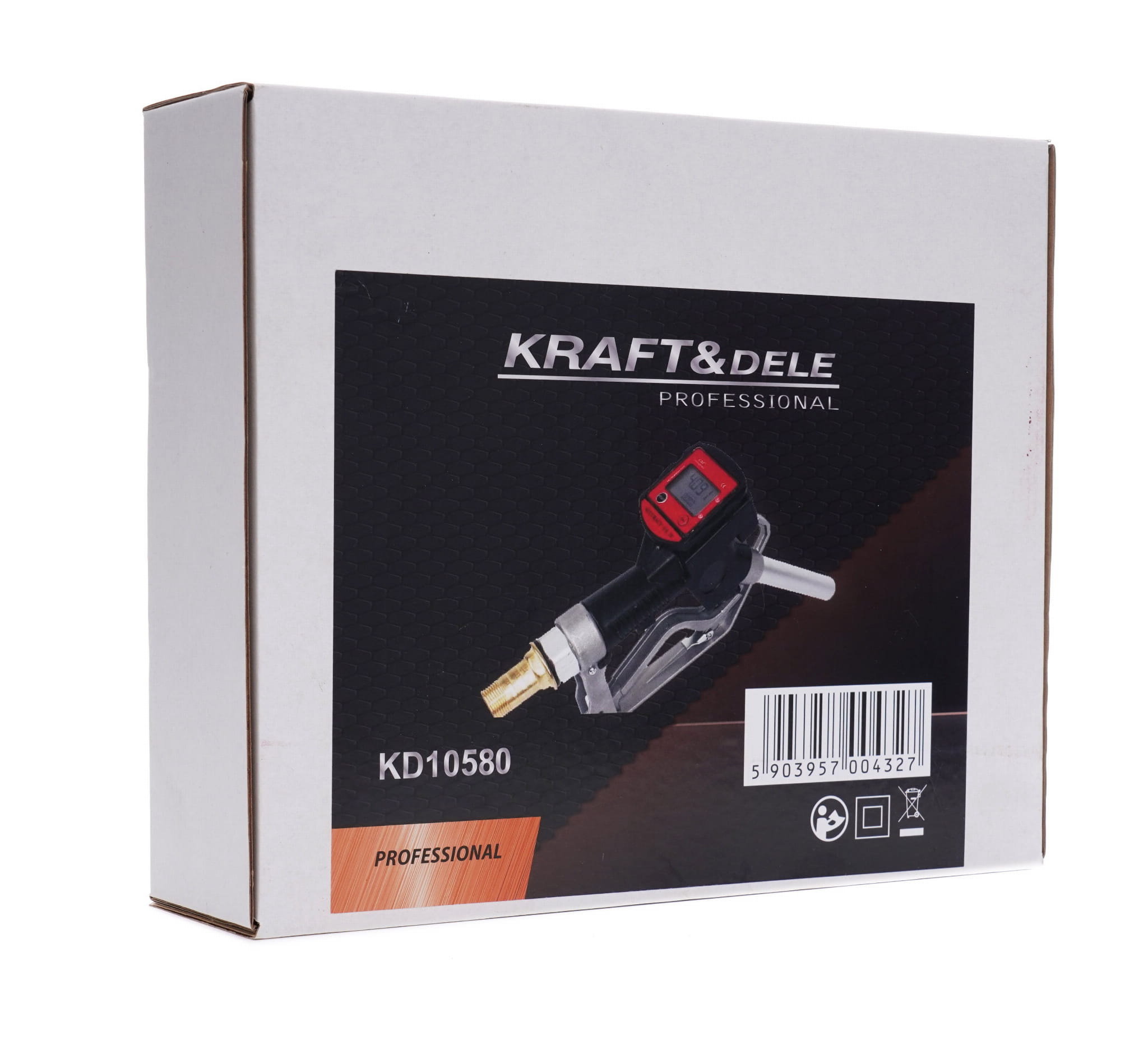 Automatyczny pistolet do paliwa KD10580 marki Kraft&Dele przeznaczony do precyzyjnego nalewania benzyny, oleju napędowego, oleju opałowego i ropy naftowej. Wyposażony w elektroniczny licznik z wyświetlaczem LCD umożliwia bieżące śledzenie przetłoczonej objętości cieczy. Aluminiowa obudowa zapewnia odporność mechaniczną przy wadze nieprzekraczającej 1,4 kg.