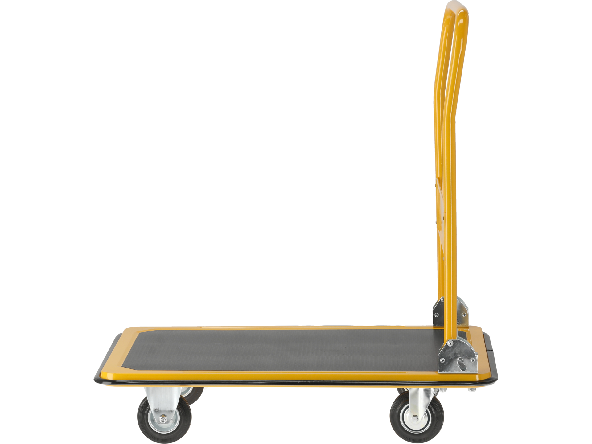 Platforma wyposażona w powłokę antypoślizgową zapobiega przesuwaniu się ładunku podczas transportu. Gumowe brzegi pełnią funkcję odbojników chroniących zarówno przewożone przedmioty, jak i ramy drzwi, ściany czy inne wózki przed uszkodzeniami mechanicznymi podczas manewrowania.