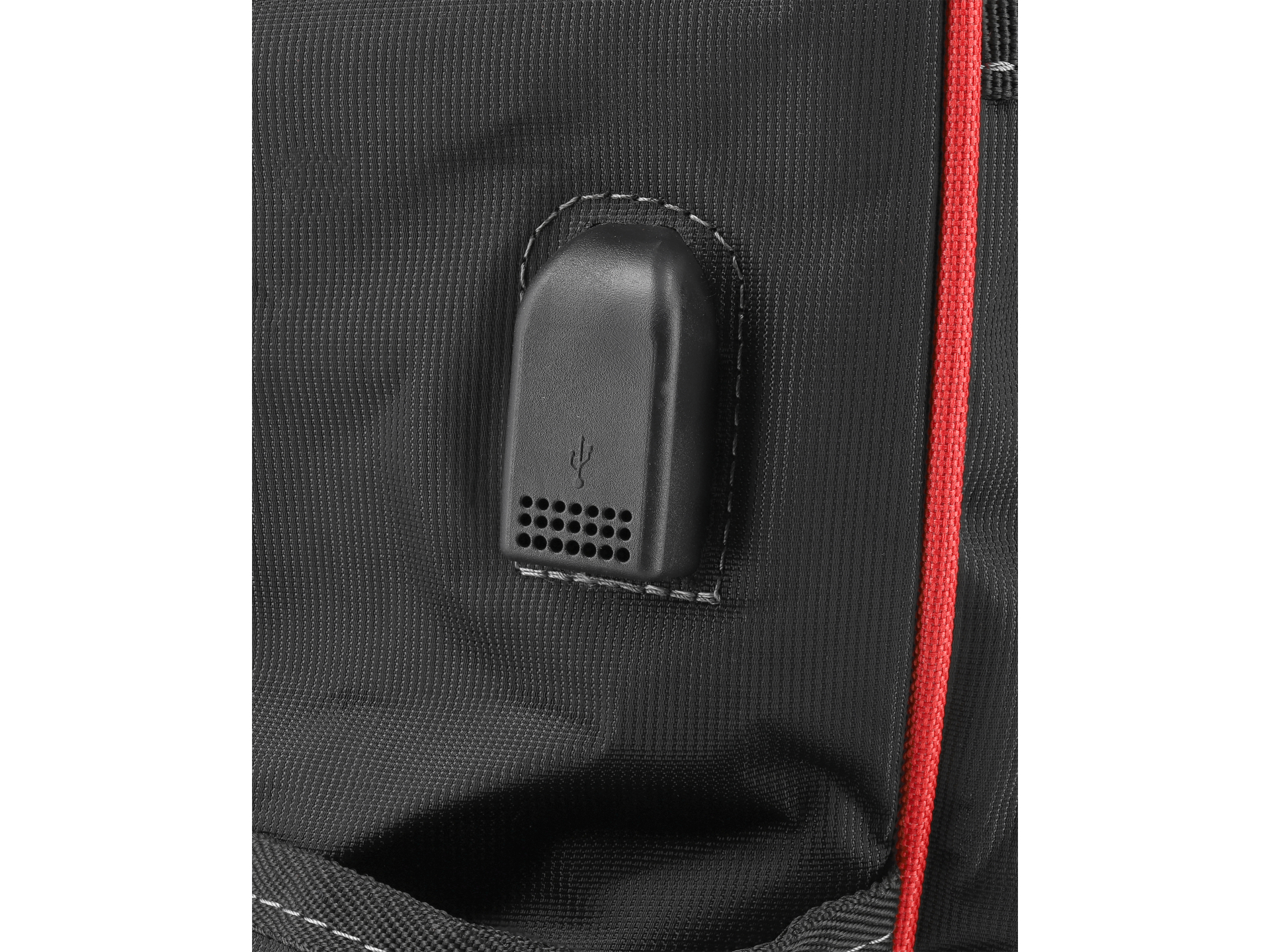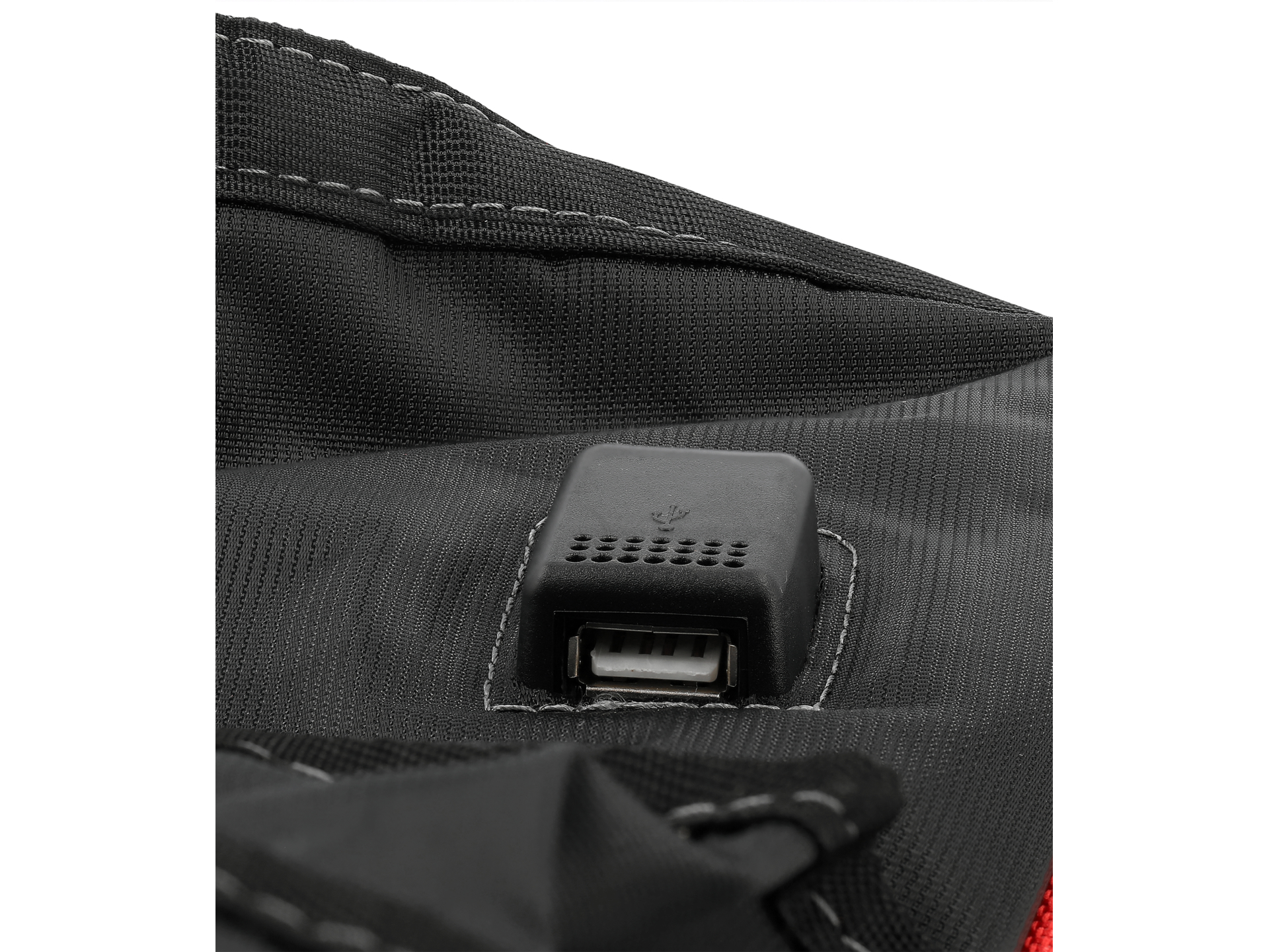 Zewnętrzne gniazdo USB połączone z wewnętrzną kieszenią umożliwia podłączenie powerbanku i ładowanie urządzeń mobilnych bez otwierania plecaka. Rozwiązanie przydatne podczas pracy w terenie, gdzie dostęp do zasilania jest ograniczony.